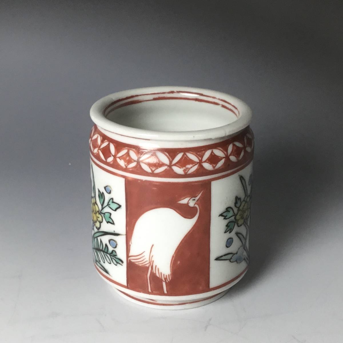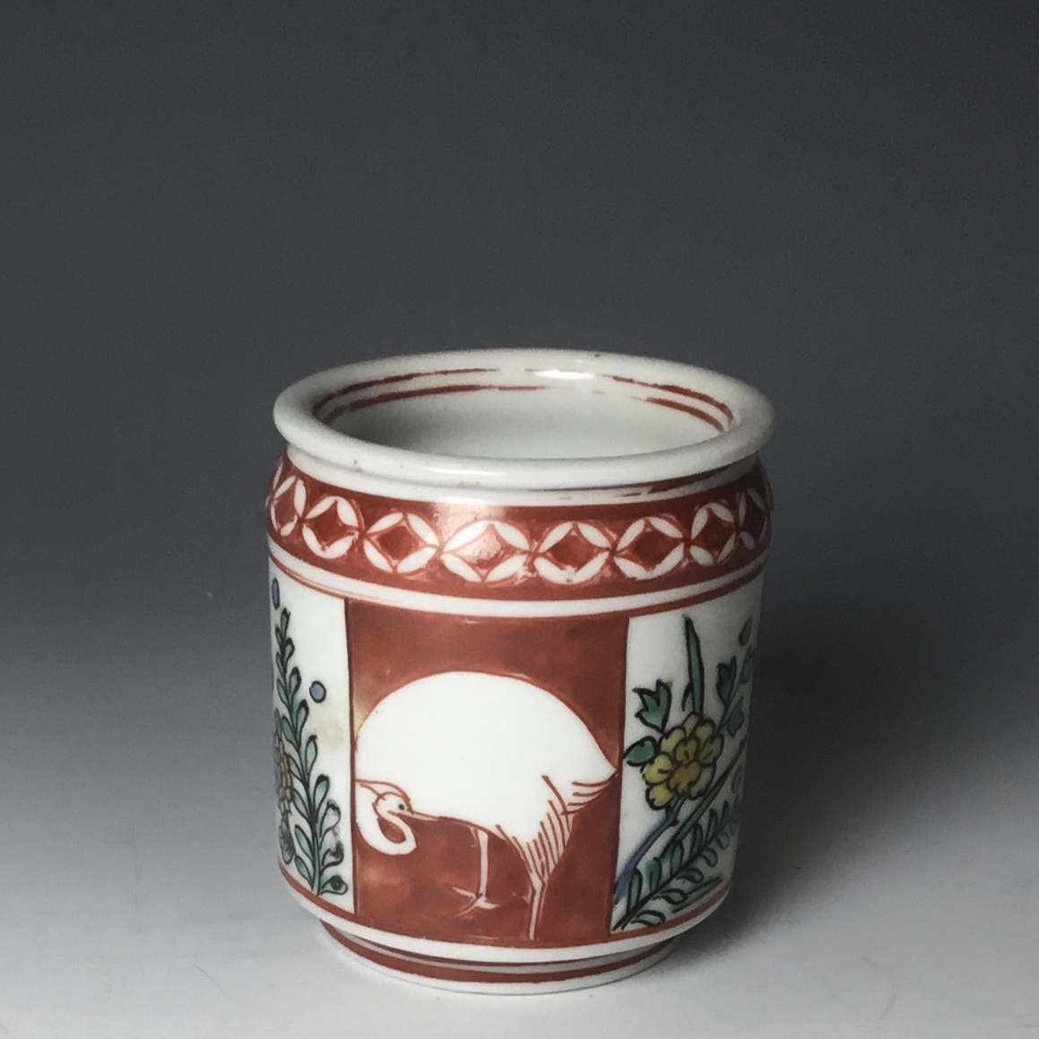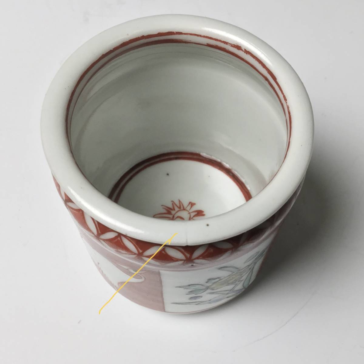 (翔)古伊万里 色絵 江戸後期 文化文政期 鷺 白抜 牡丹 のぞき 猪口 珍しい形 裏銘 ⑤ 1800年代前後