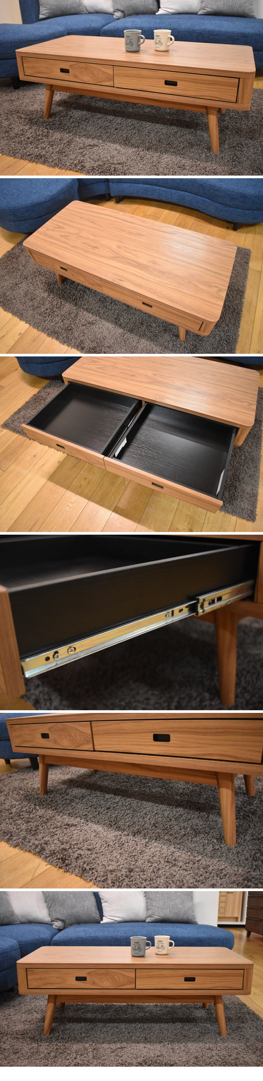 北欧スタイル110cm幅 ウォールナット柄センターテーブルです。 引出し2杯はフルオープンスライドレール式で奥の収納物も出し入れしやすいです。 シンプルでお洒落なセンターテーブルです。 |