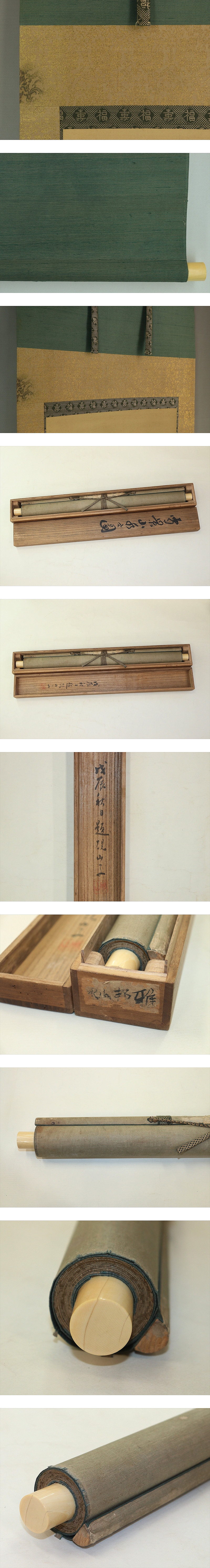 橋本雅邦 はしもと-がほう(1835-1908) 明治時代の日本画家。天保6年7月27日生まれ。江戸出身。 幼名は千太郎,のち長卿。狩野雅信に入門。 フェノロサ,岡倉天心らの鑑画会に参加し,狩野芳崖らと新画風を開拓。 明治23年東京美術学校(現東京芸大)初の日本画教授となる。 31年辞職して天心とともに日本美術院を創立した。 明治41年1月13日死去。74歳。 本紙は、染み、ヤケがあります。 表装は、染み、汚れ、軽い折れ、皺、虫食い、破れ、ほつれ、ヤケ、 軸先に汚れと傷み、箱に破損があります。 【サイズ】 作品 横約42cm×縦約109cm 表装 横約56cm×縦約191cm |