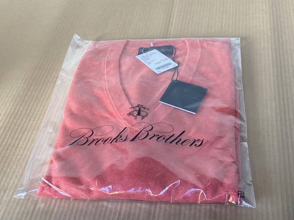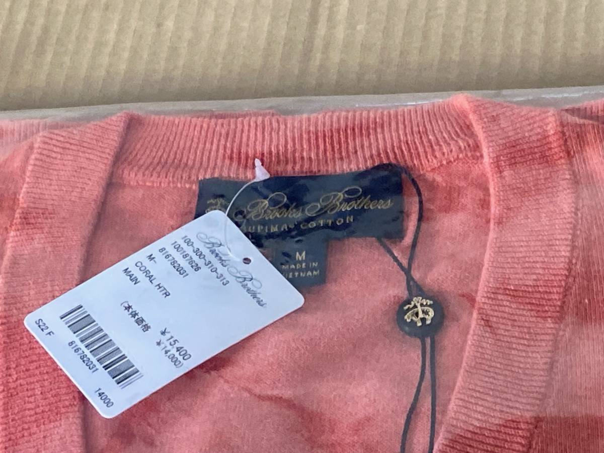 ブルックスブラザーズ スーピマコットン Vネックニットセーター オレンジ M です。 私はこちらのセーターの熱狂的ファンです。 何がそんなによいかというと着心地と暖かさです。暖房の効いたオフィスでは真冬でもこのセーターで大丈夫 です。また、最期の写真にありますように、ネットに包んで洗濯機で洗濯したあと、広告等の上で自然乾燥させることで 自宅でも選択ができるのです。 こちらのMサイズですが、リージェントの15を着用している方に丁度よいと思います。 因みに私は、175cm、75kgです。