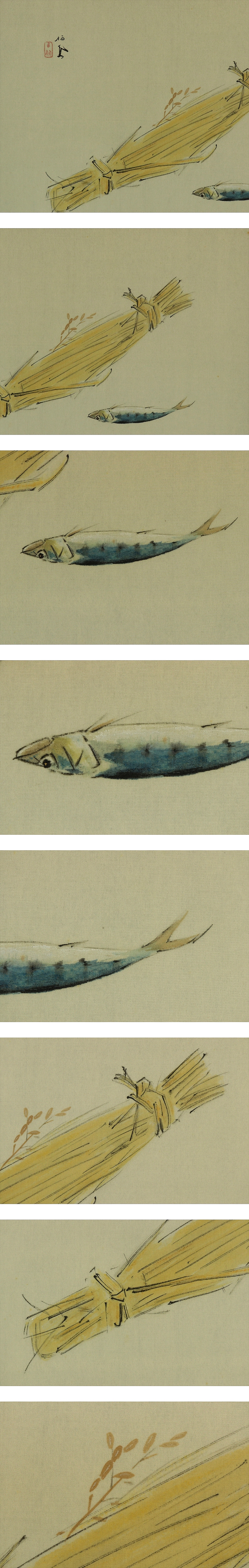 | №2303089【模写】竹内栖鳳【初松魚】◆絹本◆識箱◆二重箱◆太巻◆掛軸 | |