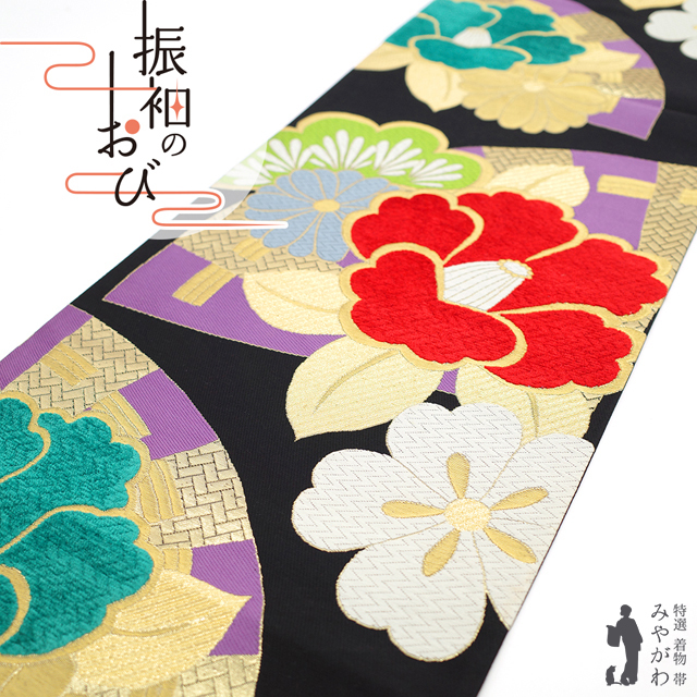 振袖用 袋帯 フォーマル 着物 成人式 結婚式 振袖 正絹 絹 金箔糸 モール織 黒 椿 松 菊 リサイクル 新古品 仕立て上がり みやがわ sb51145