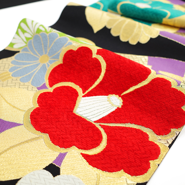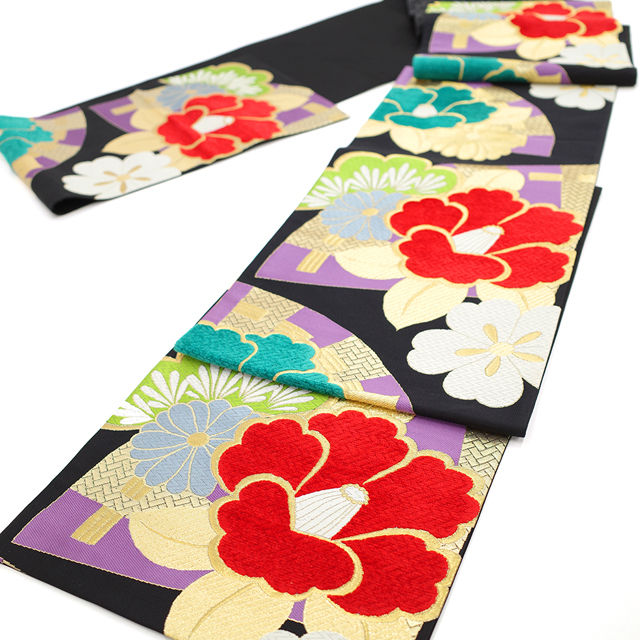 【新古品】 振袖用 袋帯 正絹 絹 黒地 金箔糸 モール織 椿 松 菊 花柄 フォーマル 着物 成人式 二十歳 20歳 結婚式 結納 パーティーなど 六通柄 販売 購入 リサイクル 未使用 美品 新古品 仕立て上がり みやがわ sb51145