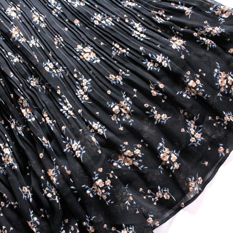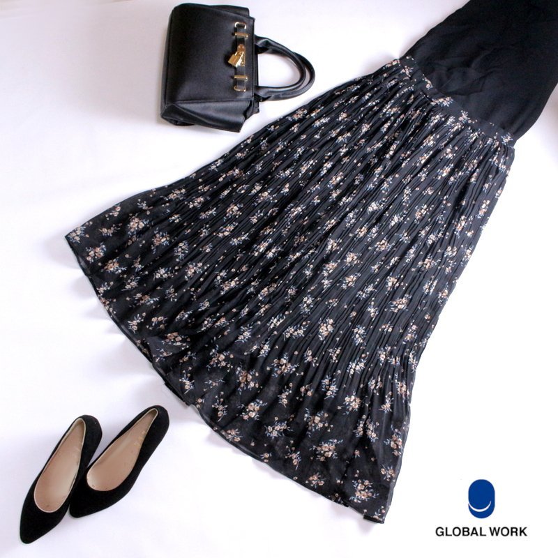 美品 グローバルワーク GLOBAL WORK ■ 春 夏 ロング丈 フラワー 柄 ふんわり ナチュラル シワプリーツ ロングスカート M ブラック 黒