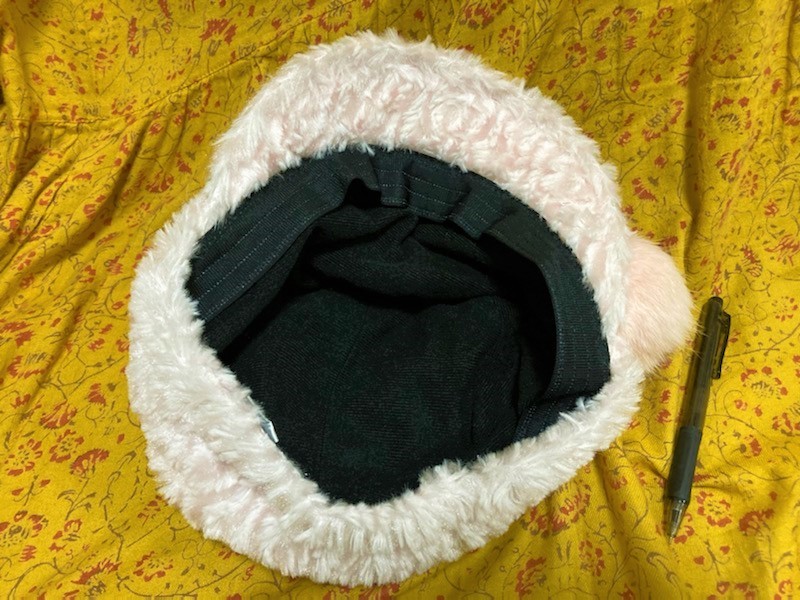 ♪全体が淡いピンクのお色目、短めのつばがあり、キャスケットのようなデザインです。左側面のボンボンもかわいいポイントです。