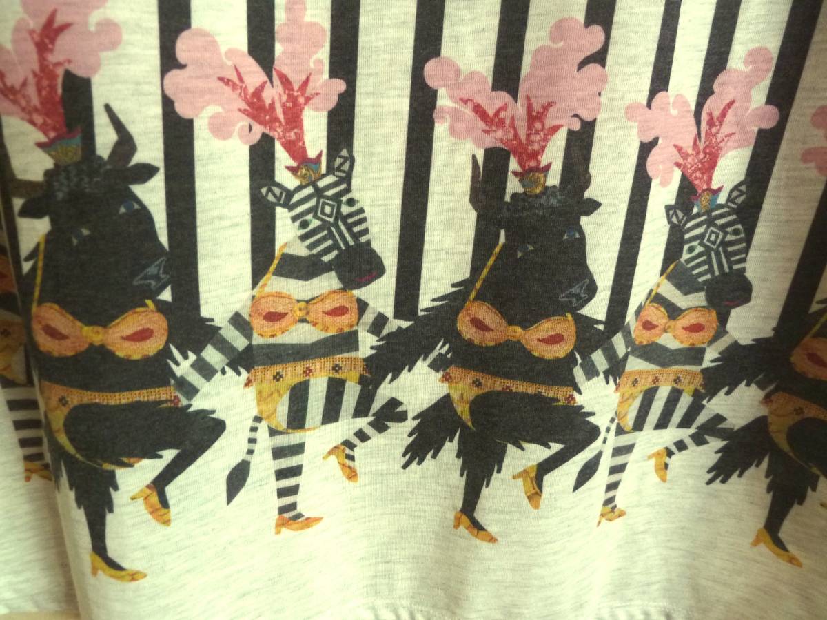 コメント | タグは外してありますが未着用です。サンバのような衣装をまとったシマウマとウシと色合いが素敵です。ポリエステル混紡なので薄くてサラリとした生地です。両ポケット付きです。 |