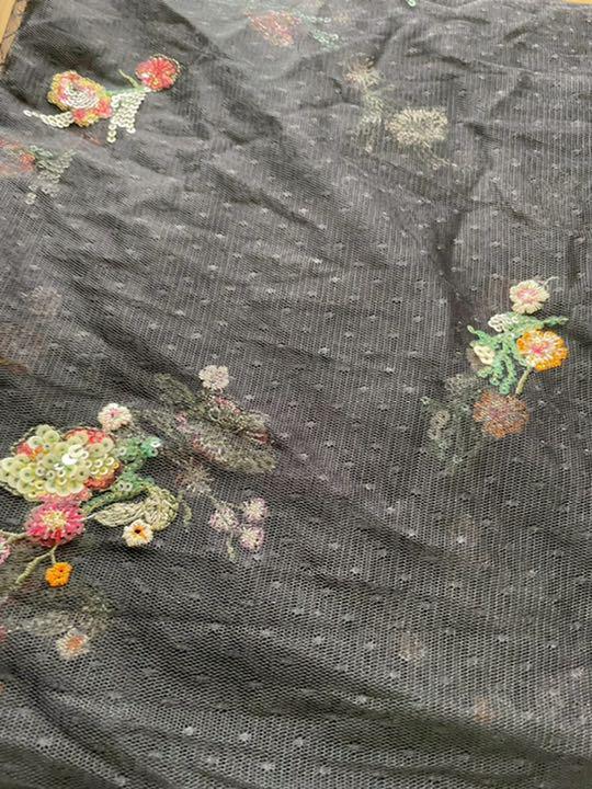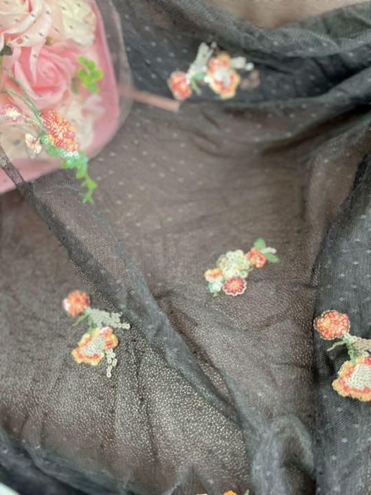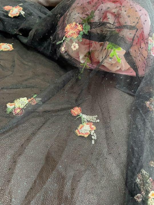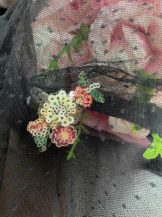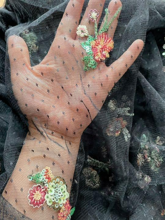 ドット柄ネットレースにキラキラなスパンコールと糸でお花模様を刺して、(≧≦)光に当たっるとキラット輝いて可愛いです