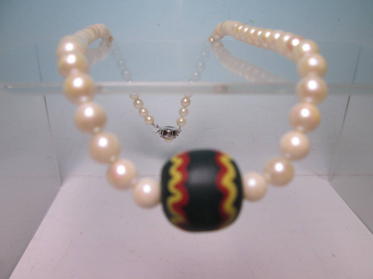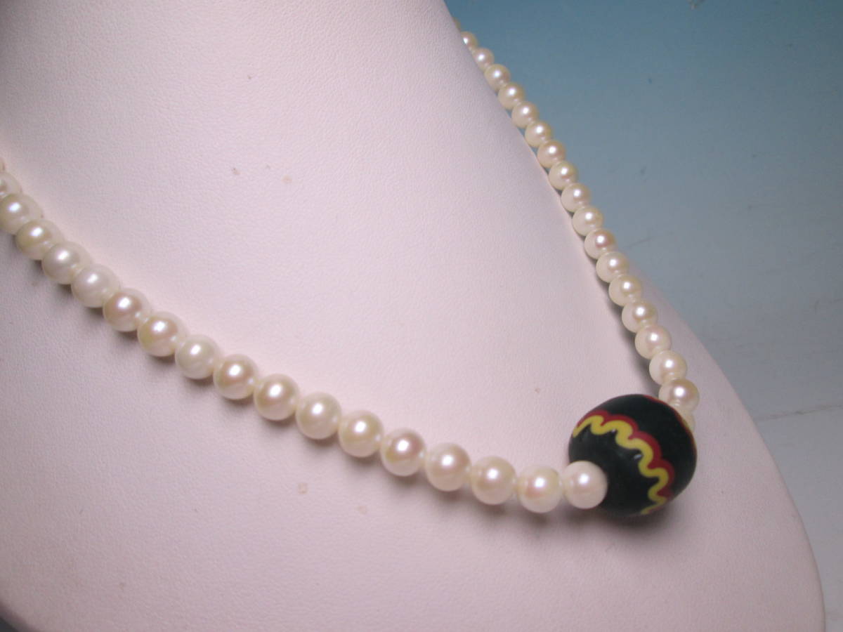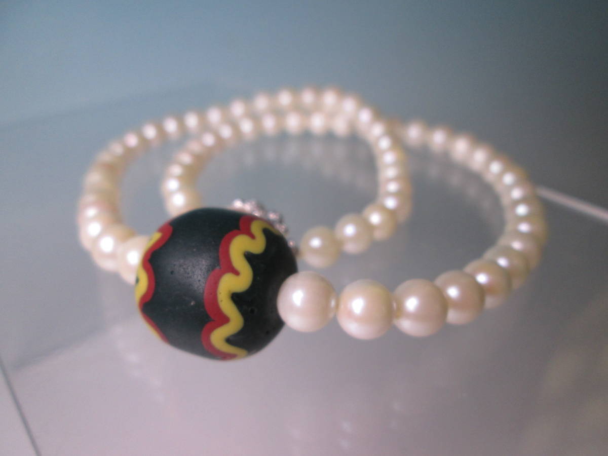 本真珠のネックレスにモダンな文様の蜻蛉玉を通しています。