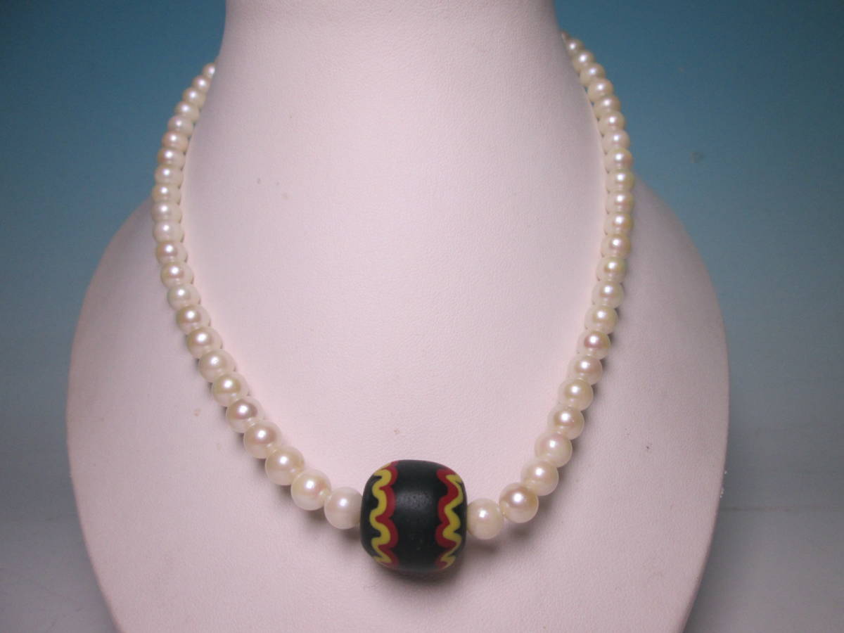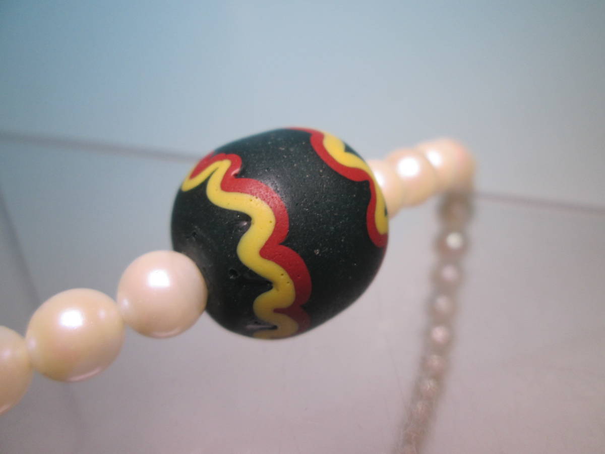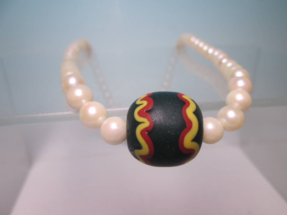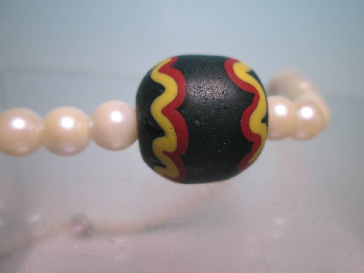本真珠のネックレスにモダンな文様の蜻蛉玉を通しています。