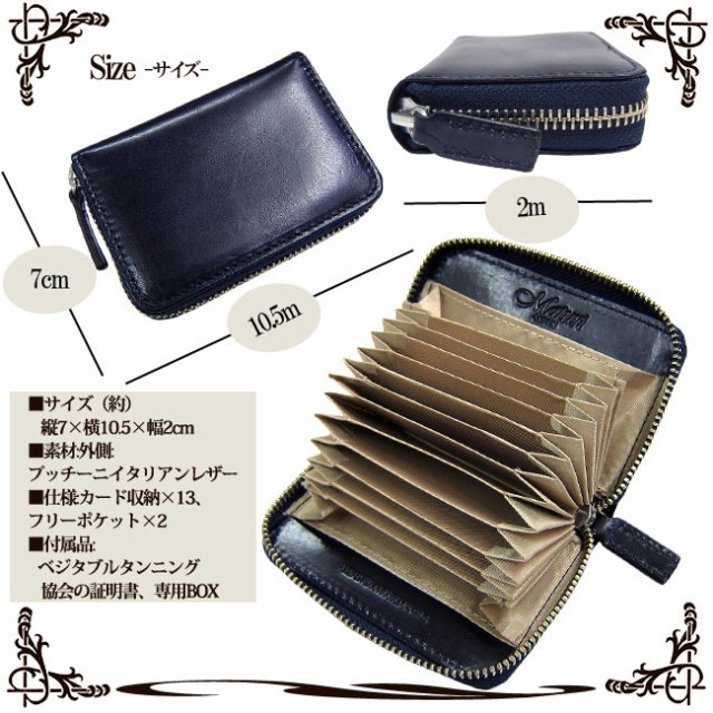 | 扇のように大きく開き、必要なカードをひと目で見つかると同時に指も入るので取り出しやすさ抜群です。 フリーポケットを含め、合計15ヶ所に収納可能。 ポイントカードや診察券でいっぱいの財布をすっきりしてくれる、便利なアイテム。 高い生産基準を満たした「イタリア・ベジタブルタンニング協会」認定の高品質イタリアンレザーを大胆に使用し、 飽きの来ないシンプルかつスタイリッシュなデザインに仕上げました。 カラー・仕様共に、年齢問わずご愛用いただけるカードケースです。 ■カラー:ネイビー ■サイズ(約):縦7×横10.5×幅2cm ■素材:外側/プッチーニイタリアンレザー、内側/ナイロン ■仕様:カード収納×13、フリーポケット×2 ■付属品:ベジタブルタンニング協会の証明書、専用BOX 【ベジタブルタンニング協会の証明書とは】 イタリアの伝統的な革なめし業に従事するタンナーが所属する組合。 小さな血筋、しわ些細な傷は天然素材の証明でありそれぞれの革をこの世で唯一のものにしています。 メンバーが供給するレザーには環境への配慮、皮革の自然さ、鞣し行程の高い生産基準などの条件を満たした、 高品質なイタリアでなめされたベジタブルタンニングレザーであるという証の証明書が付きます。 また、証明書にはシリアルナンバーが一枚一枚印刷されており、偽造出来ない唯一無二のものです。 【訳あり商品】 こちらは新品・未使用ですが、製造過程による細かい傷、ノリ汚れ、擦れ等がございます。 通常のご使用には問題ございませんが、神経質な方は入札をお控え下さい。 ※こちらの商品は全てにおいてノークレーム・ノーリターンです。 ご了承の上、入札下さいませ。 --革製品について-- ・製作過程により多少の傷、汚れ、縫い目が粗い、塗装にムラ、接着剤跡等がある場合が御座います。 ・天然素材の商品は、自然由来の素材のため革には細かなシワや傷跡・トラ等が存在する場合があります。 ※シワなどは、動物の生育環境や年齢、個体によって異なる、革の特性です。 ・商品の仕様・デザインは、製品向上の為に予告なしに変更になる場合がございます。 ・掲載している写真は、ご使用のコンピュータの環境や撮影の光加減によって実際の商品のイメージと多少異なることが御座います。 これらについては予めご理解頂いた上でご購入お願いします。 | |