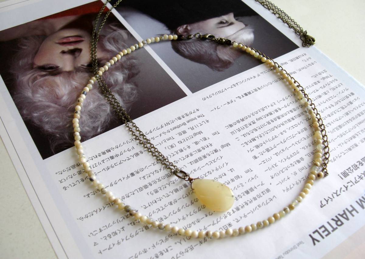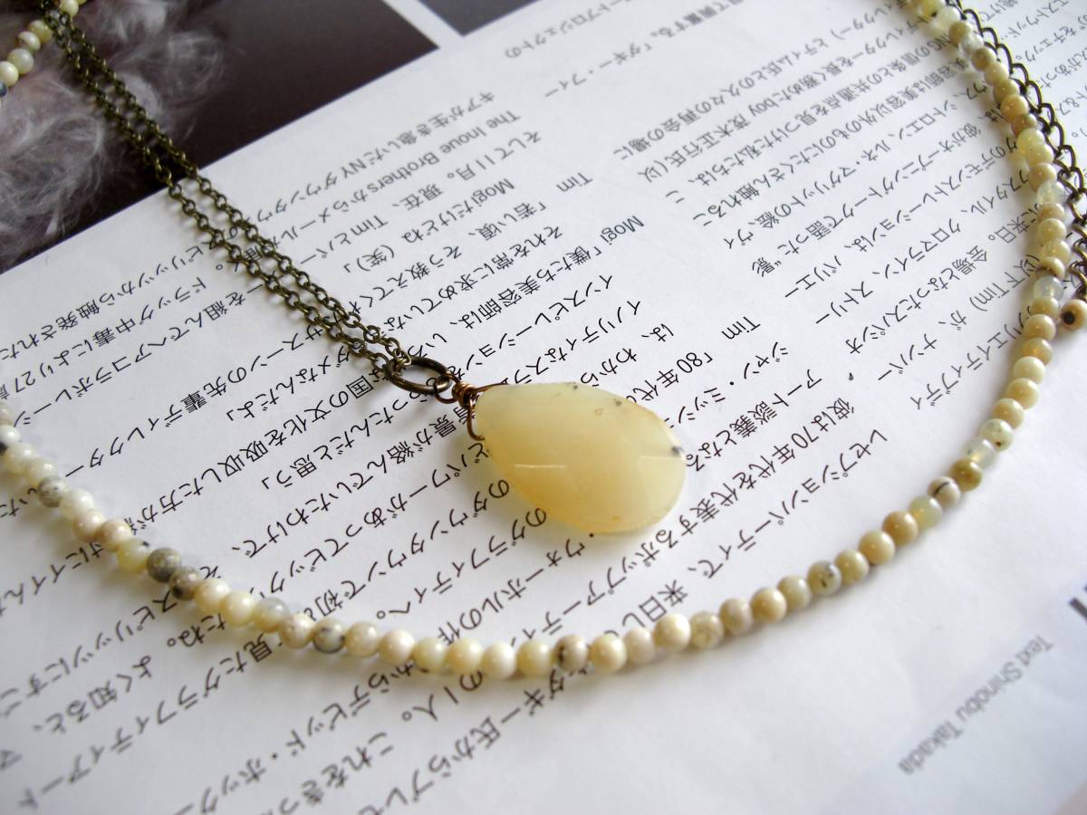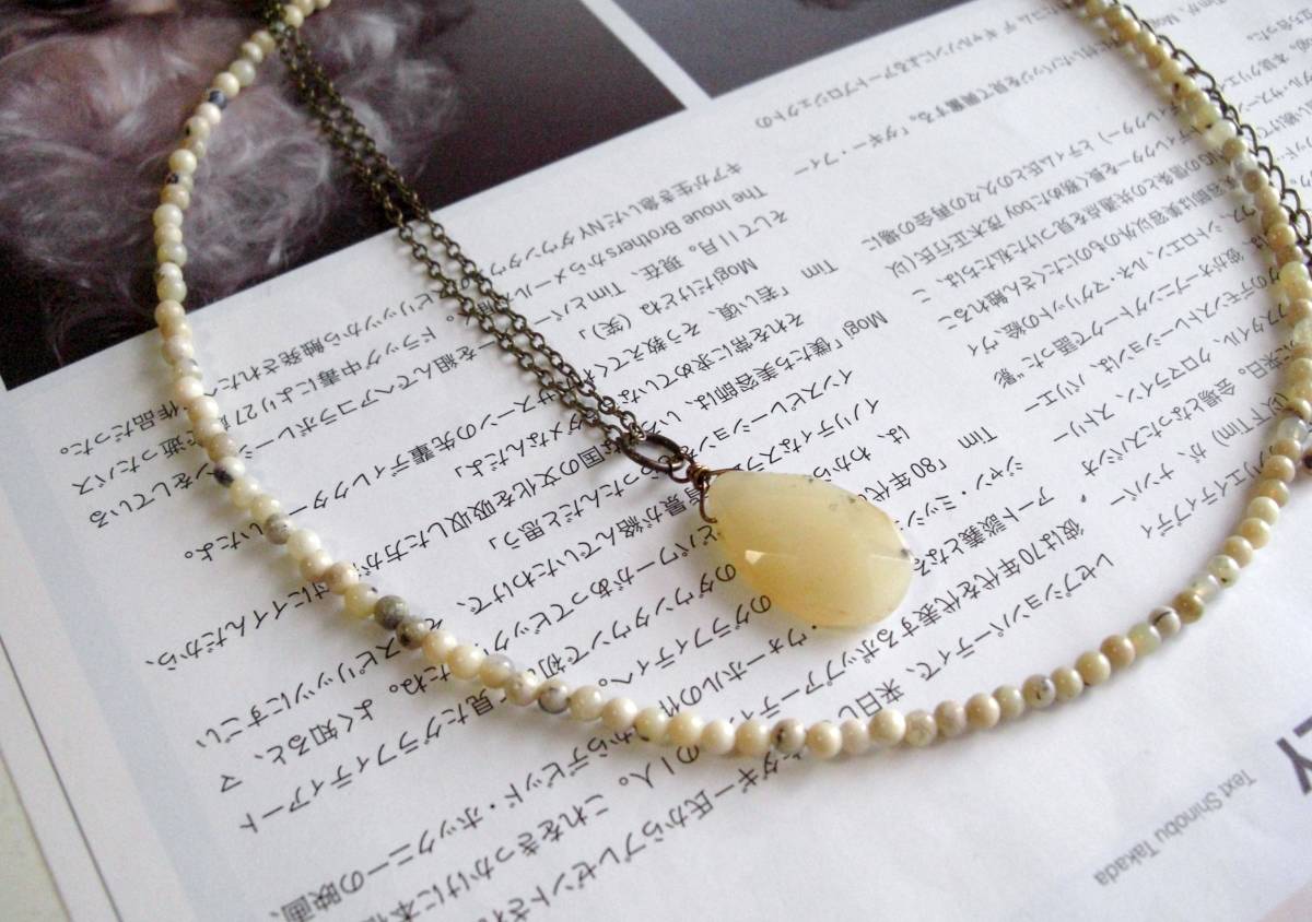 巴里色を繋いで・・シリーズです♪大人色の石を合わせて・・ナチュラルなアフリカンオパールとイエローオパールのネックレス2本セットです♪3ミリの丸玉のアフリカンオパールはシンプルなデザインです♪長さは42センチ+アジャスター15センチで最長57センチ位です♪22×15ミリのイエローオパールは華奢なチェーンを合わせました♪長さは76センチ+アジャスター11センチで最長87センチ位です♪それぞれ単品やお揃いのシリーズも出品しています♪ハンドメイドをご理解頂いてノークレーム、ノーリ ターンでお願いします♪