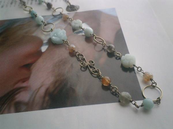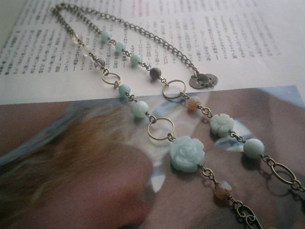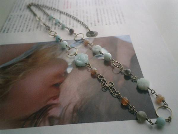 イノセントなパターン・・シリーズです♪仏蘭西映画の薔薇・・ロマンチックなアマゾナイトのネックレスです♪6ミリ、8ミリの丸玉、10ミリ、14ミリの両面薔薇のアマゾナイトに6ミリの丸玉、8ミリのコインのルチルクォーツやチェコビーズやデザインチャームを合わせて大人のロマンチックしています♪長さは全長68センチ位で調節自由です♪チョーカー風にされても素敵です♪同じデザインの長さ違いのネックレスやブレスレットやピアスも出品しています♪♪シンプルで飽きのこないいつまでも着けられるデザインを考えて作りました!ハンドメイドをご理解頂いてノークレーム、ノーリターンでお願いします