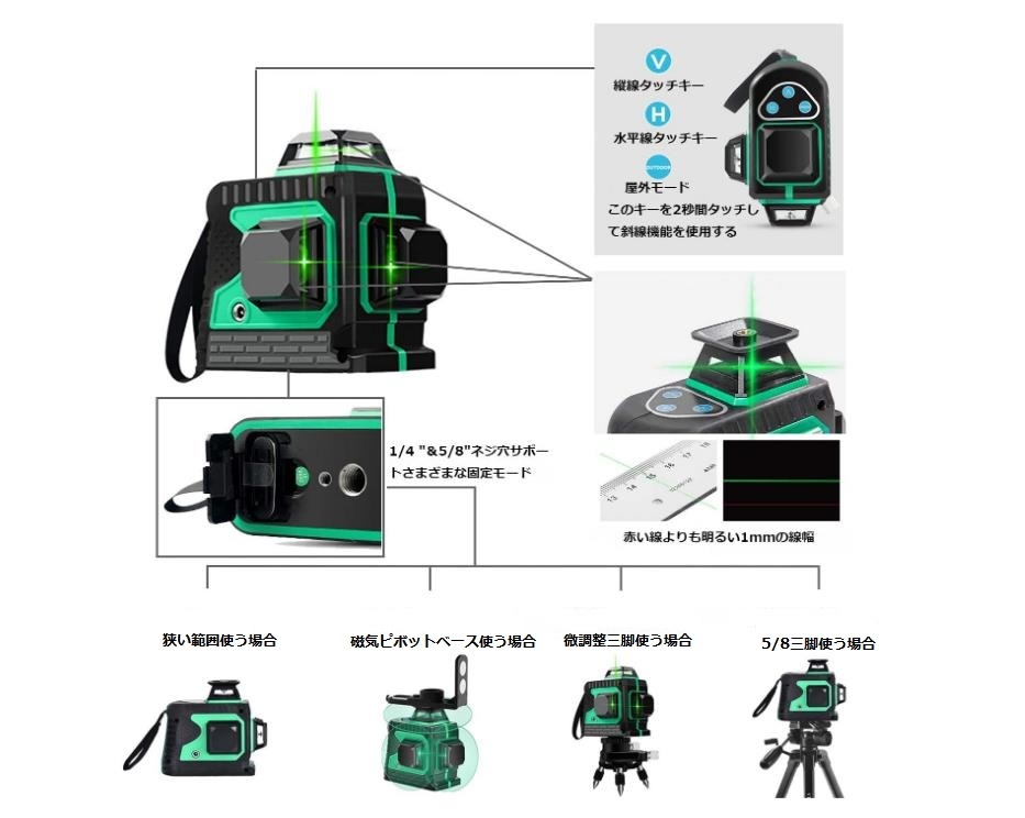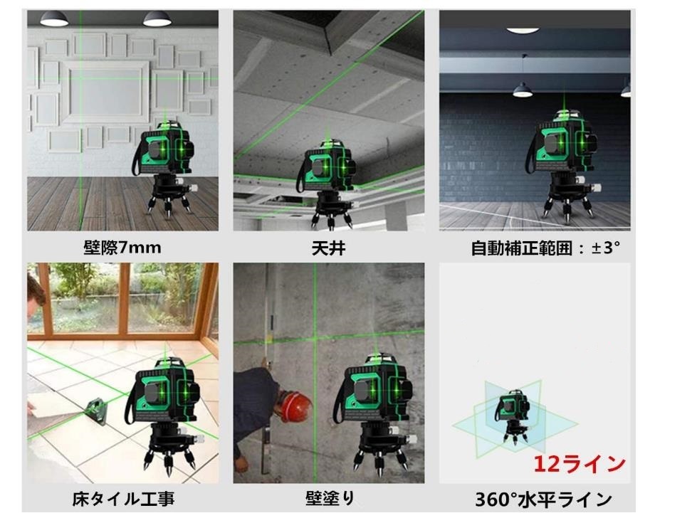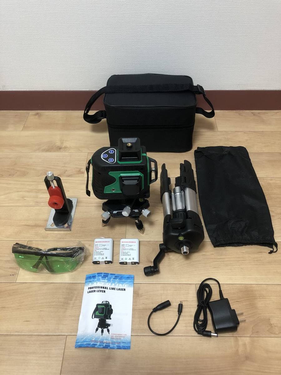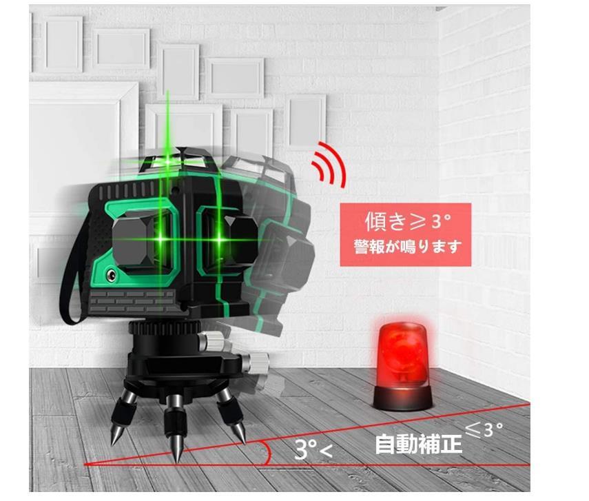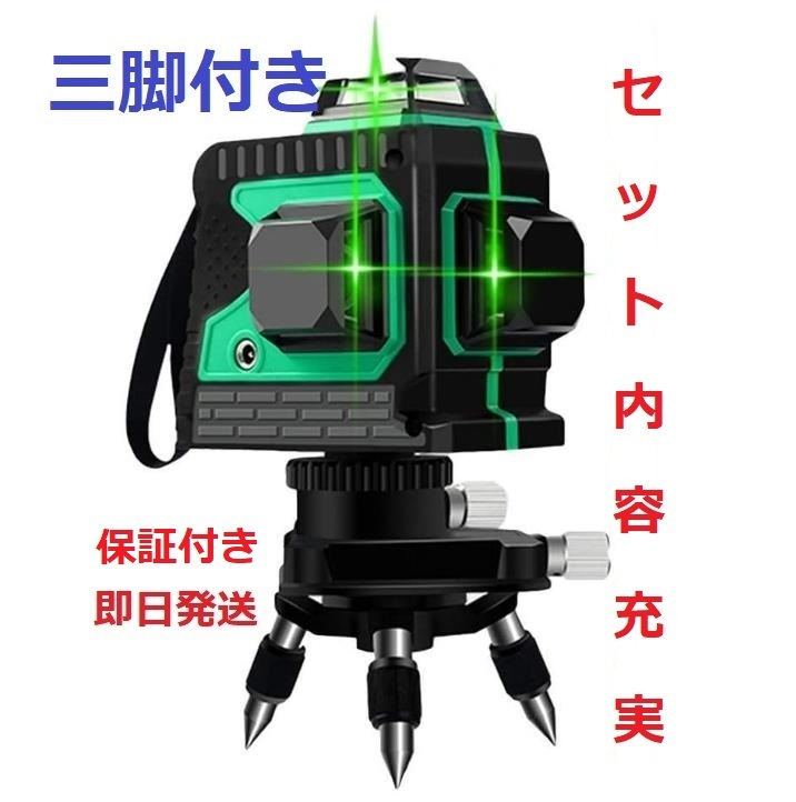 12ライン グリーン レーザー墨出し器 3D墨出器/測定器/墨だし器 墨出し機水平器/自動補正機能 高輝度 高精度 360°4方向大矩照射 三脚付き