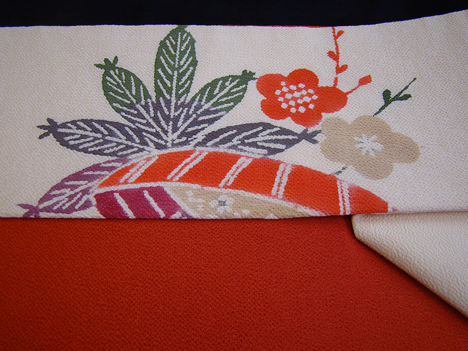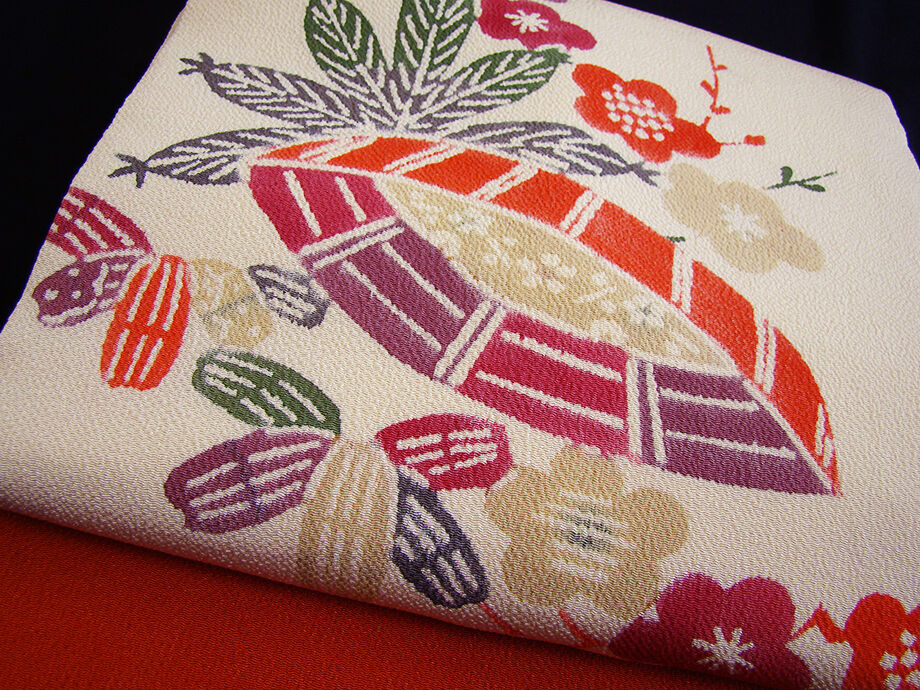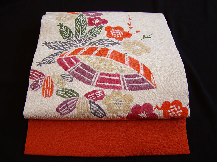 | 商品説明 | しなやかなぽってりとした上質な生地の手触り良いちりめんのなごや帯。 薄卵色地に朱赤色ぼかし染に朱、葡萄、緑色等の花柄の染柄。 たいこ柄。 |