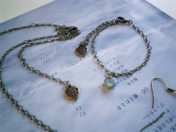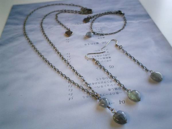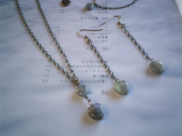 時の隙間シリーズです♪過去と未来の夢を探して・・♪天使の贈り物(?)繊細な輝きのラブラドライトのネックレス、ブレスレット、ピアスの3点セットです♪シックでシンプルなデザインでさりげなく楽しんでいただきたいです♪ラブラドライトは10ミリと8ミリの大きさ違いのハートです♪ネックレスは8ミリと10ミリのハートを重ねてキュートなデザインです♪長さは全長70センチで調節自由です♪ブレスレットは8ミリのハートのラブラドライトを合わせました♪長さは全長22センチ位で調節自由です♪ピアスは10ミリのラブラドライトです♪長さは7.5センチ位です♪ピアスはイヤリングにも変更出来ます♪3点ともシックにロマンチックにまとめました♪♪パリ(??)っぽいアンティークな雰囲気で作りました。シンプルで飽きのこないいつまでも着けられるデザインを考えて作りました!ハンドメイドをご理解頂いてノークレーム、ノーリターンでお願いします