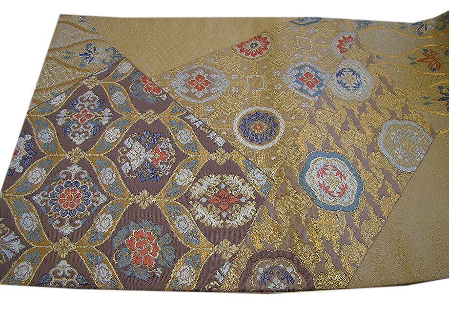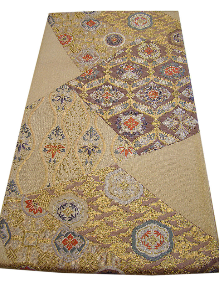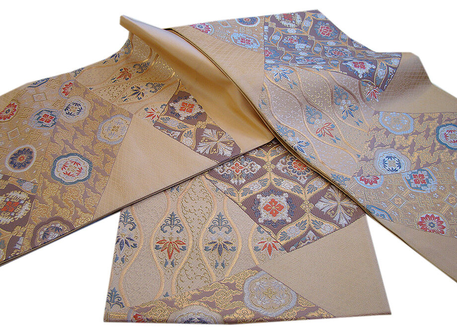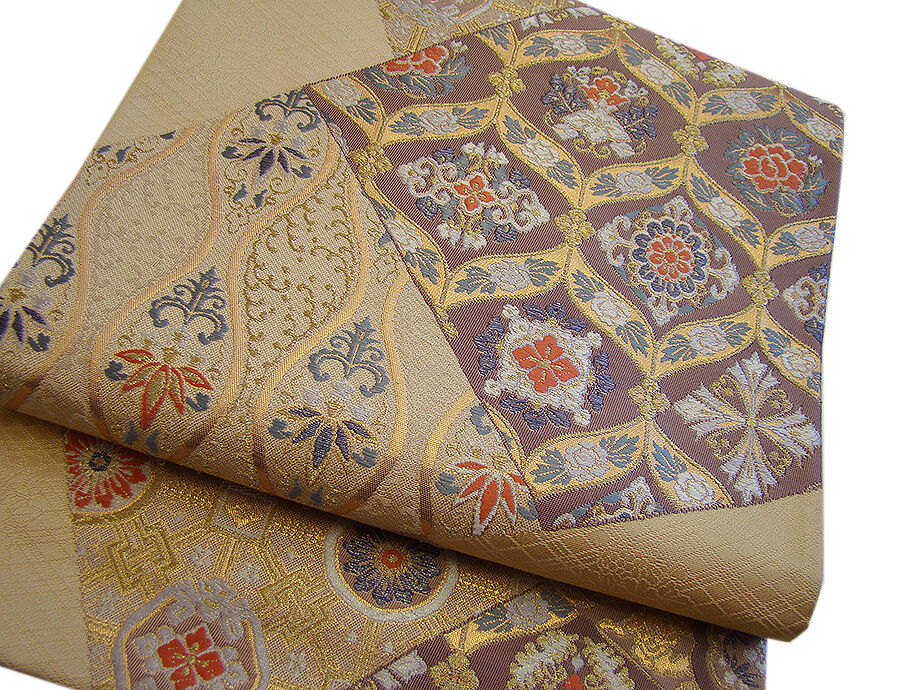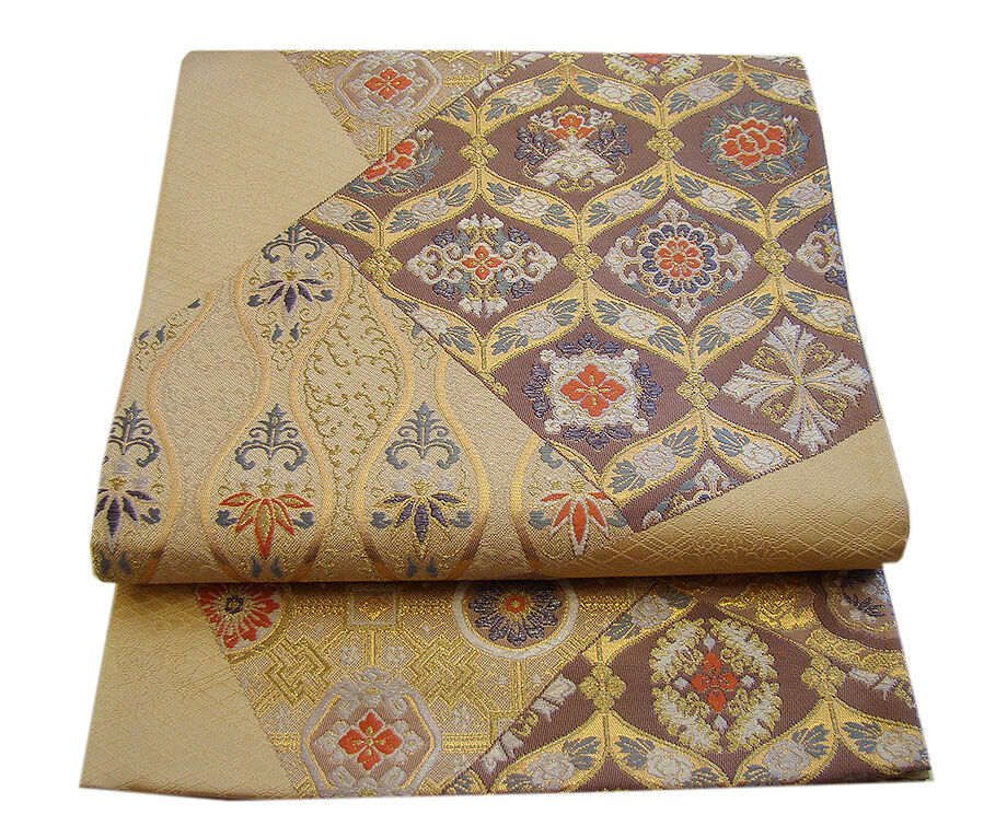 商品説明 | とてもしなやかでふっくらとした手触りの〆易く扱い易い重厚感溢れる西陣織の袋帯。 薄い飴色地に金糸や紅梅、紺、藍鼠、ライトグレー色等の立涌、華文等の織柄。 六通柄。 ロング寸。 |
