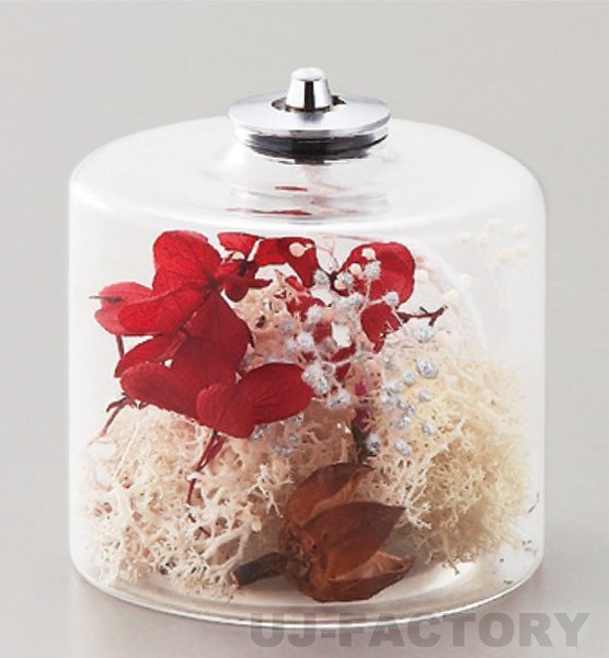 | 【 ここがポイント 】 ★herbarium(ハーバリウム)とは、もともと植物の観察用標本として保存したものを指します。そのハーバリウムが新たに観賞用として注目を集めています。それらをさらにオイルランプに仕立てたものがハーバリウムランプです。オイルランプのタンクにハーバリウムの手法でブリザーブドフラワーを詰め、レインボーオイルを注入して点灯します。炎の灯りがオイルを透過し、植物をほんのり幻想的に照らします。