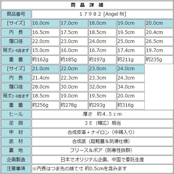 ピンクとサックス2色、16センチ~24センチまでを用意し、姉妹のペアルックにぴったり、寒い季節での通学やお出かけにお勧めの1足です。