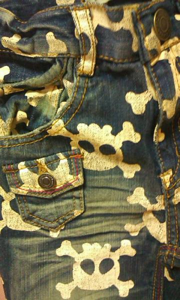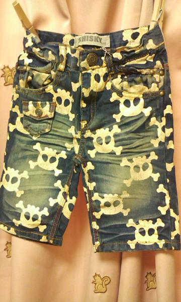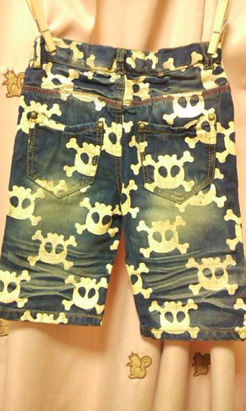 ◆逆さドクロのプリントが格好いい!シワ加工やウォッシュ感もオシャレなデニムハーフパンツ