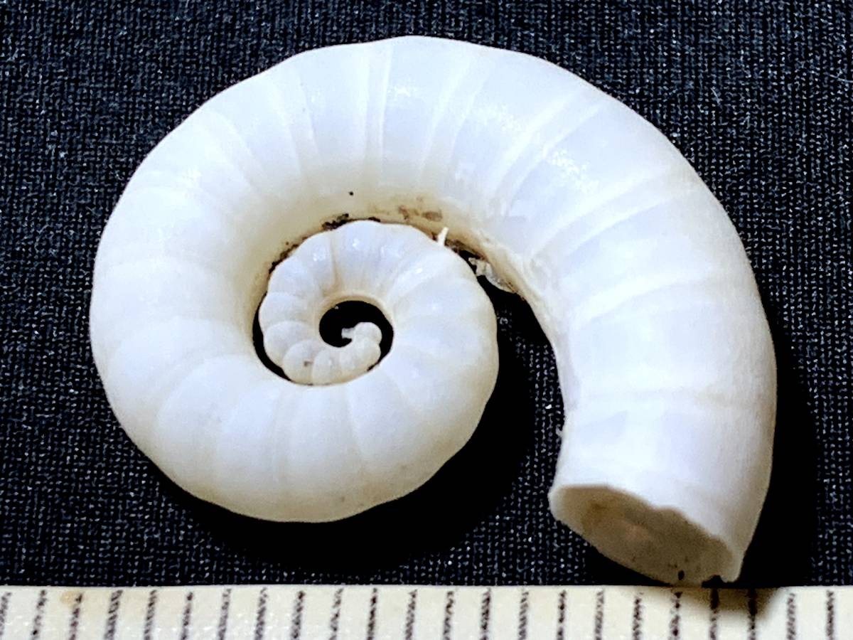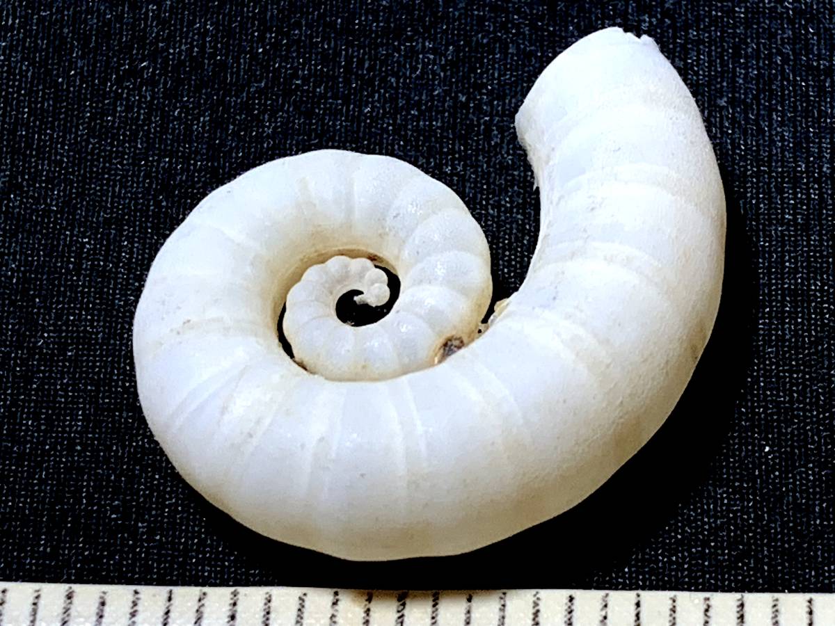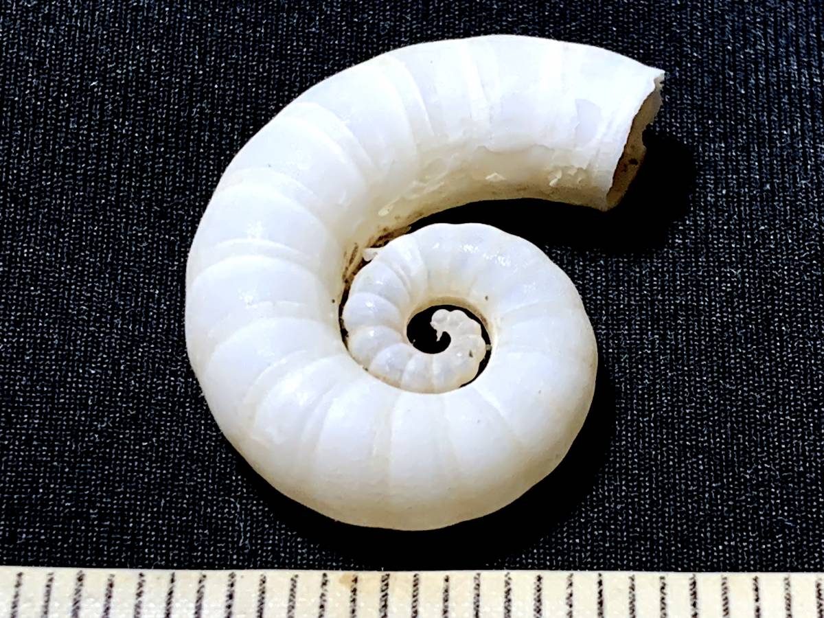 【商品の説明】 産地:中華人民共和国(産地詳細不明) サイズ:写真に写り込んだメジャーで推測してください。 重量:1グラム未満 進化の名残のように体内に貝殻状のものが入ったイカがいて、それを取り出したものがこれだということです。どの向きから見て「右巻き」というのかよくわかりませんが、お送りするのは写真の品です。商品整理上(貝殻標本)と名付けておりますが、「イカ」ですから、正確には(海洋生物標本)と書くべきところですが、その点はどうかご容赦ください。