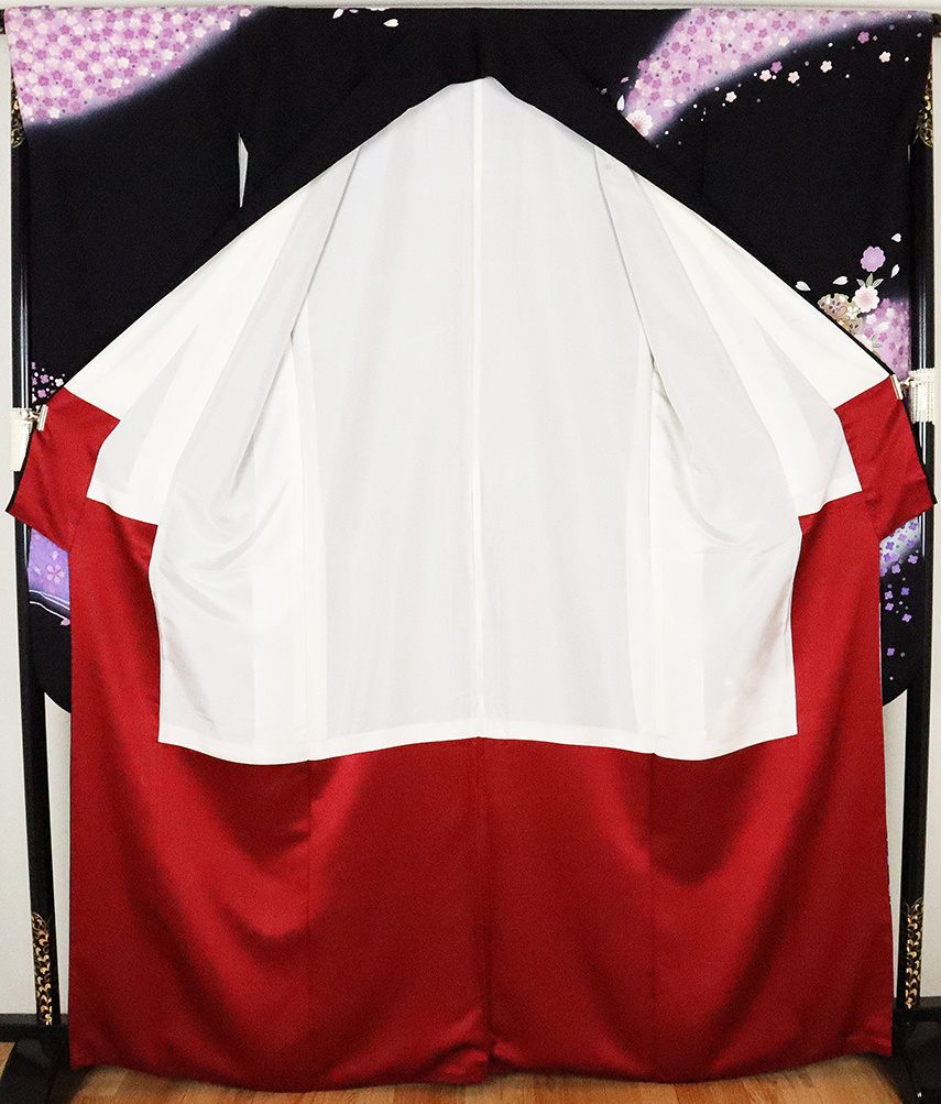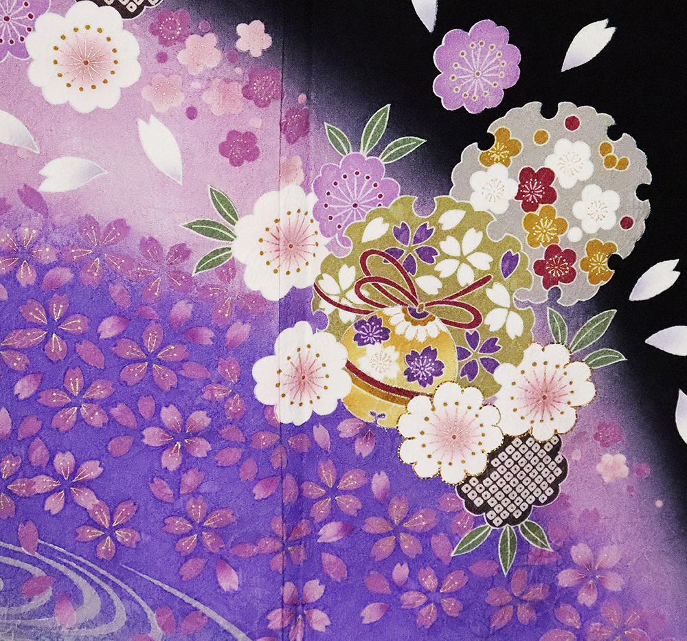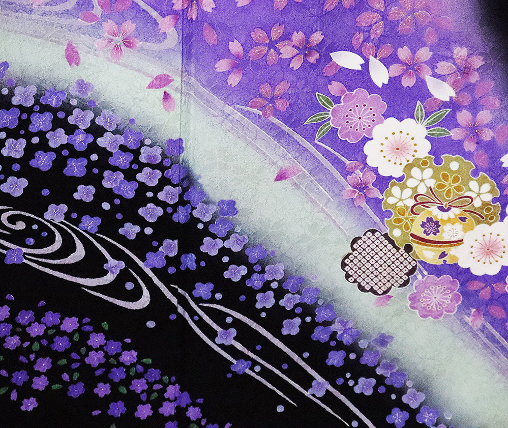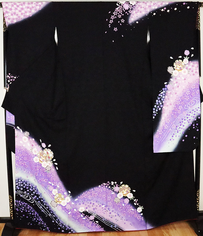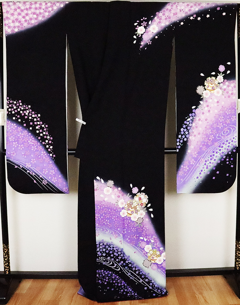 本振袖 袷 丹後縮緬 綸子生地 黒・ピンク・紫ぼかし桜綸子地桜・梅・雪輪紋 174 広襟 トールサイズ | |