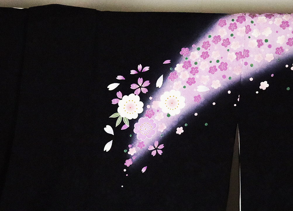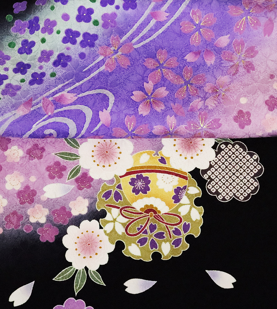 色・柄 | 本振袖 袷 丹後縮緬 綸子生地 黒・ピンク・紫ぼかし桜綸子地桜・梅・雪輪紋 (写真では上手く色が出ない場合があります。ご了承下さい) 写真の枚数が多いので一度パソコンでご覧ください。 |