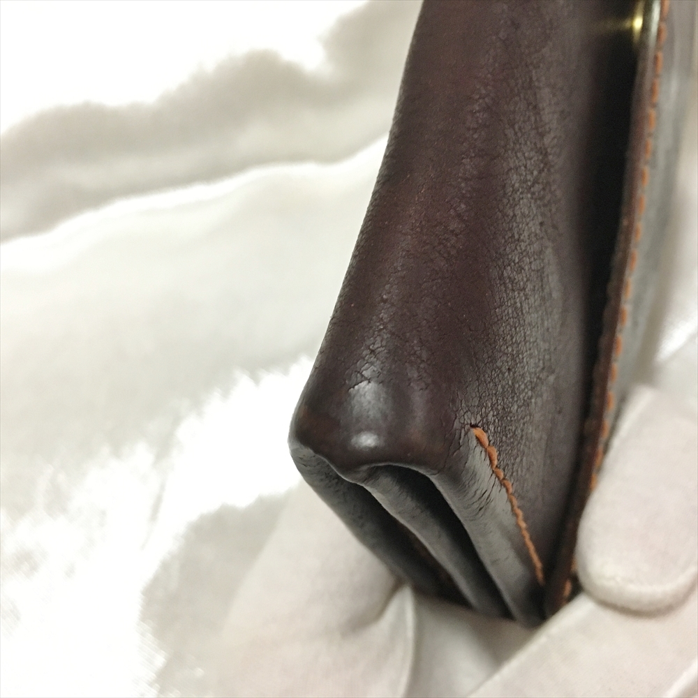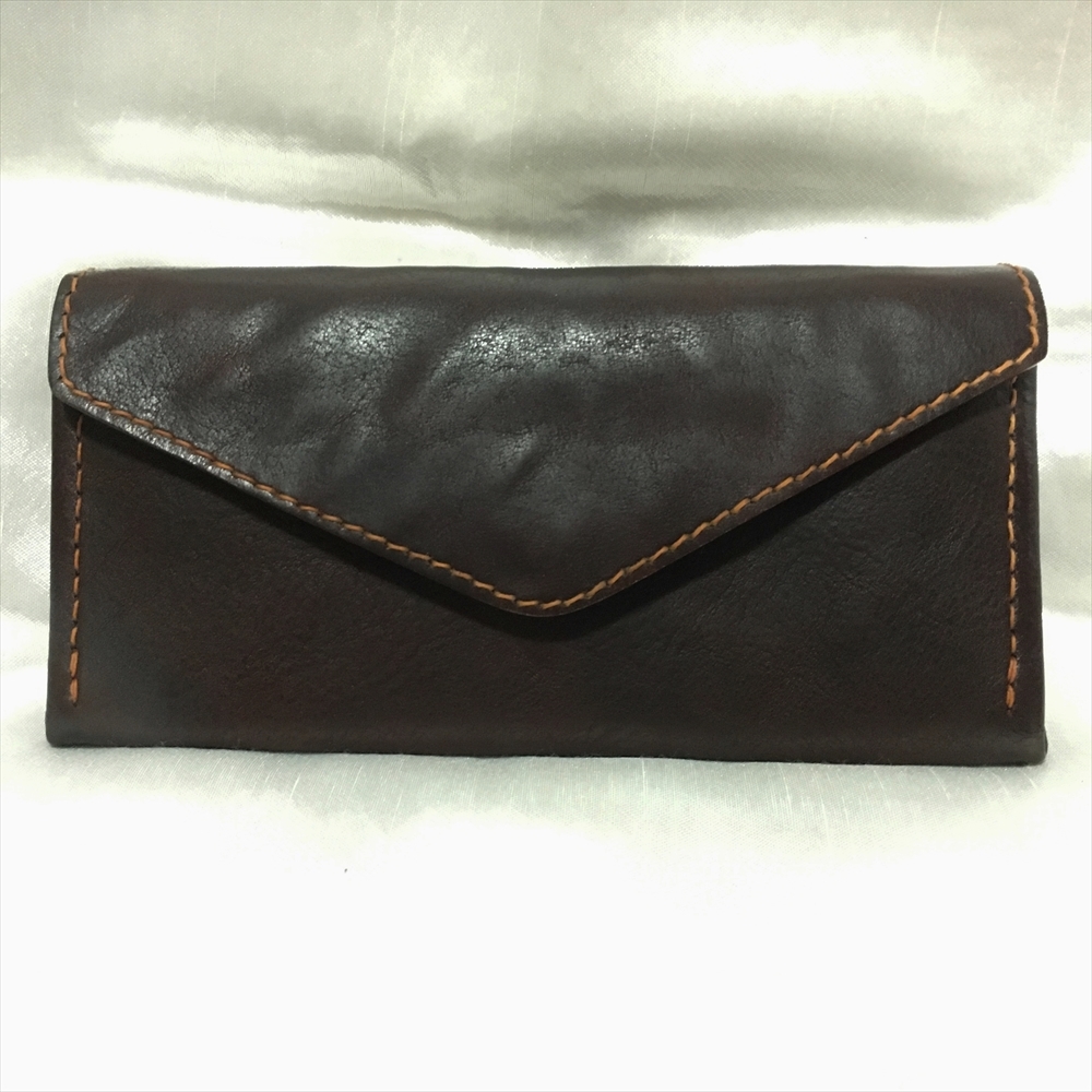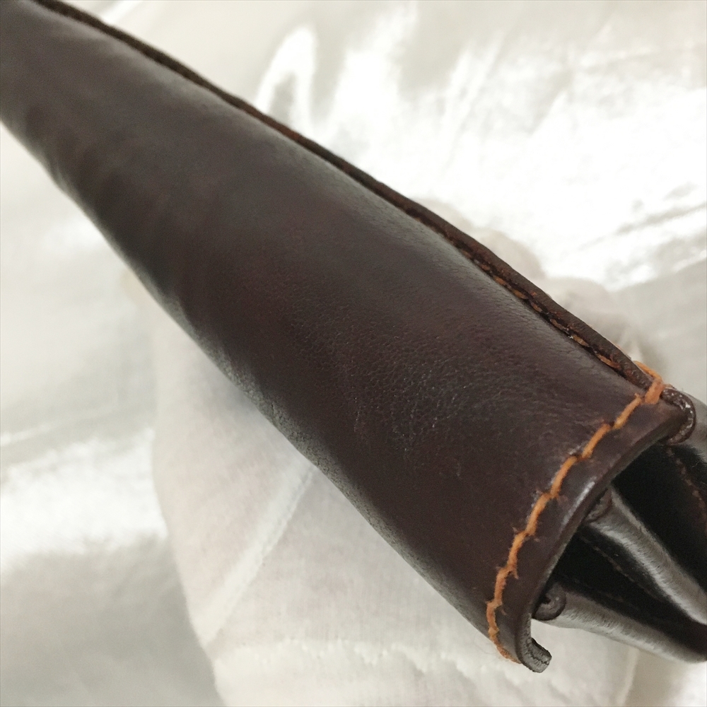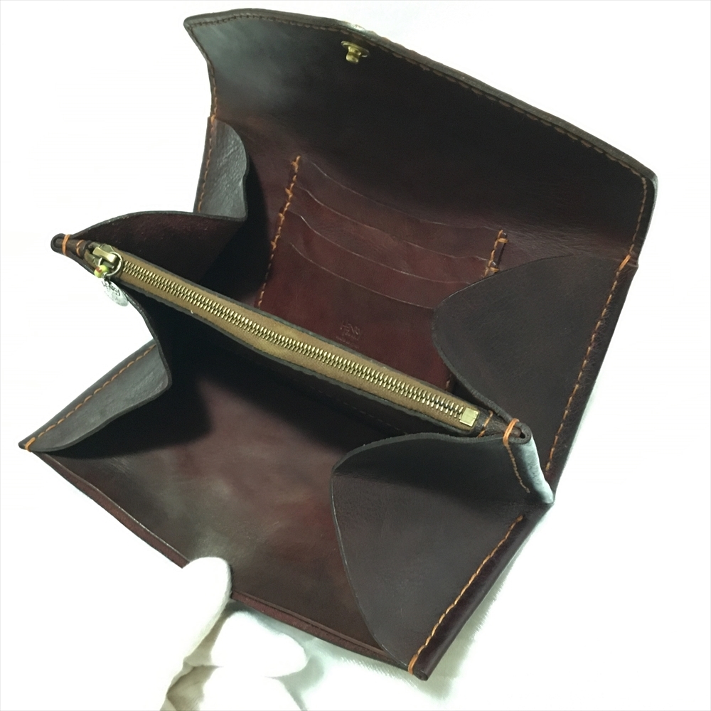 希少ブランドアンリークイールのかぶせタイプ長財布です。 完全ハンドメイドのフルレザー。とても温もりのある手作り感の強い長財布。 革特有の表情が多いのが特徴です。 1-1.3mm程度のやや厚手の革を使われており、しっかりした財布です。 大きく開く構造なので実用性も高いと思います。 外装の色はアンティークブラウンで、黒に近い茶色。 内部と床革はやや明るく赤みの強い印象です。 内部の縁周りが濃く、奥ほど明るいグラデーションとなっており、 おしゃれ且つ手に触れやすい部分の変色が気にならない色で実用性も高い仕様。 汚れやすい小銭入れも濃いめの色になっており、目立たない仕様です。 糸はロウを染み込ませた糸で、オレンジ色。糸が映えますね。 床革は毛羽立ちが無く、きれいに整えてあります。 コバは少し艶があっていい感じです。 ファスナーはriri製。ボタンは旧プリムのフィオッキ。 ボタン周りの革が硬めに作られていて、革がボタンに負けないよう工夫されてます。 ボタンの型崩れも少ないでしょう。 ビーズは黄色に緑と赤色が付いてます。 ●【状態 仕様】 状態: 中古美品 サイズ: 19.2 x 9.9 x 3.2cm 材質: 牛革 重量: 240g(本体のみ) 製造国: イタリア 定価: 不明 収納: 薄長ポケット2、大口ポケット2、コインポケット1、カードポケット4 付属品: 未使用のアイボリー色の麻袋 ●【状態詳細】 ほとんど新品のように見えるほどの美品。 外装の型崩れや磨耗はほぼ無し。曲げ部分も全くヘタり無し。 ファスナー開閉もスムーズ。ボタンもしっかり留まります。 カードポケット最上部にわずかにカード跡と 金属ボタンの色移りがわずかにあるくらいでしょうか。 ご購入お待ちしております! ____________________ 【梱包】 お安く提供させて頂くため、中古梱包資材を使わさせて頂いております。 商品が破損や汚れないよう梱包しますので、外観はご容赦下さい。 【輸送 返品】 基本安価な発送方法は補償はありません。 しかし、当方との取引で一度も届かない等の輸送事故は一度も起こっておりません。 条件付きですが、ヤフオク補償もあります。→Yahoo!補償 梱包後に発送ラベルを中心に写真を撮り、保管しております。 返品、返金は当方の過失と判断できる場合は応じます。 その他、何らかのご不満がある場合でも状況によっては応じます。 評価される前にご相談ください。 【その他】 発送は2日以内を心掛けております。 基本的に日本郵便各種サービス対応。発送方法の変更は落札前に、領収書が必要な場合などご相談下さい。 当方は他にも出品しております。 送料別商品の同梱発送は可能な限りお安く発送致します。その他の商品はこちら↓↓ KAKOTOMATOstore *~*~*~*~*~*~*~*~*~*~*~*~* この商品が購入される方のお役に立てれば幸いです。 どうぞよろしくお願い申し上げます。 *~*~*~*~*~*~*~*~*~*~*~*~* | ||