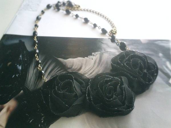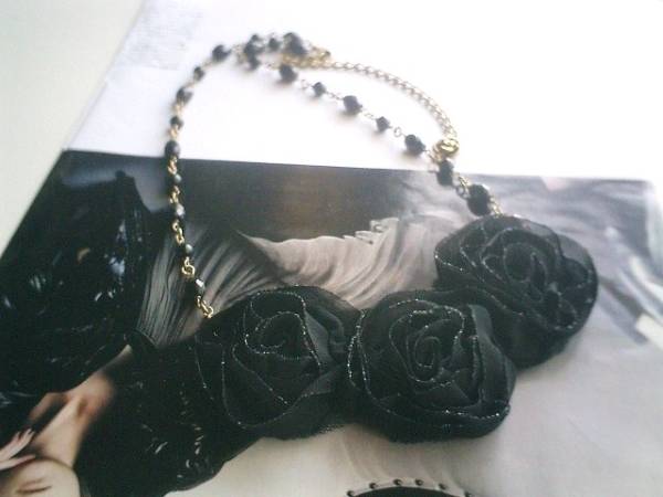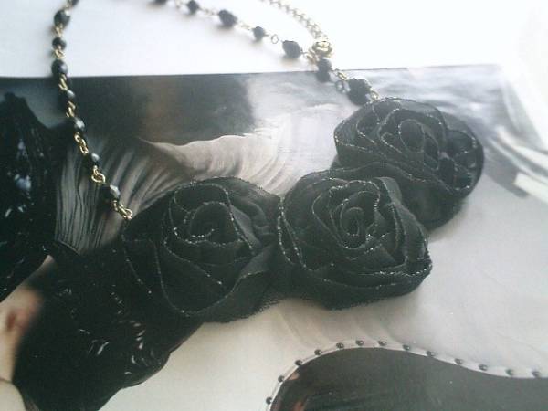 薔薇の帽子箱・・シリーズです♪シックなオニキスと薔薇のネックレスです♪オニキスは6ミリの丸玉と9ミリ×6ミリのナツメカットです♪切りっぱなしのオーガンジーとシフォンの薔薇を合わせて大人のロマンチックしています♪薔薇は1つ4センチ位です♪長さは全長63センチ位で調節自由です♪チョーカー風に着けられても素敵です♪お揃いのブレスレットも出品しています♪♪シンプルで飽きのこないいつまでも着けられるデザインを考えて作りました!ハンドメイドをご理解頂いてノークレーム、ノーリターンでお願いします