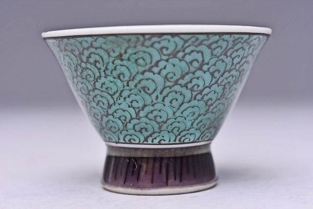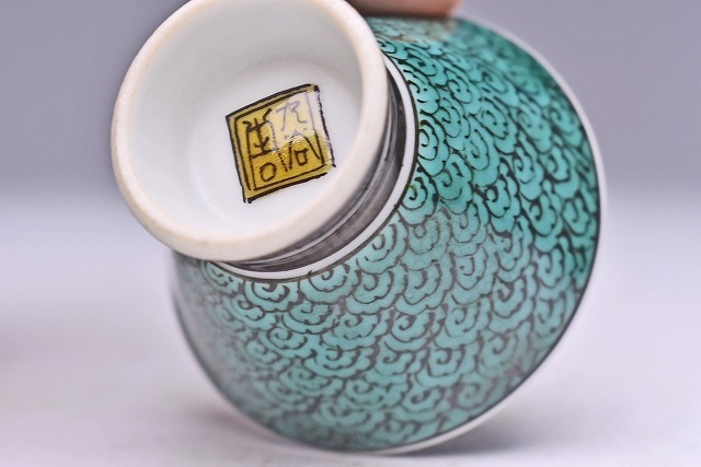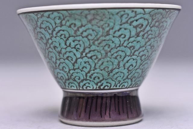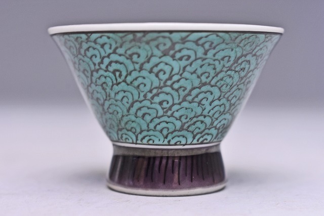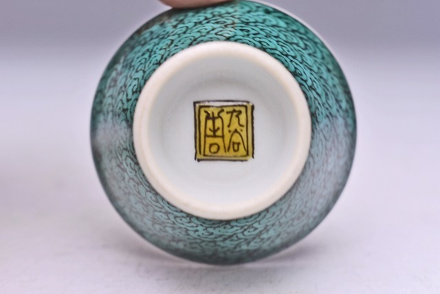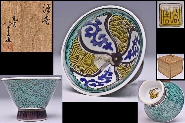 徳田八十吉 初代 ★ 九谷 ぐい呑 ★ 共箱 ★ 古九谷 写 青海波 唐草文 ★ 匠による見事な景色の逸品 ★ 検 青手九谷 吉田屋窯 ★