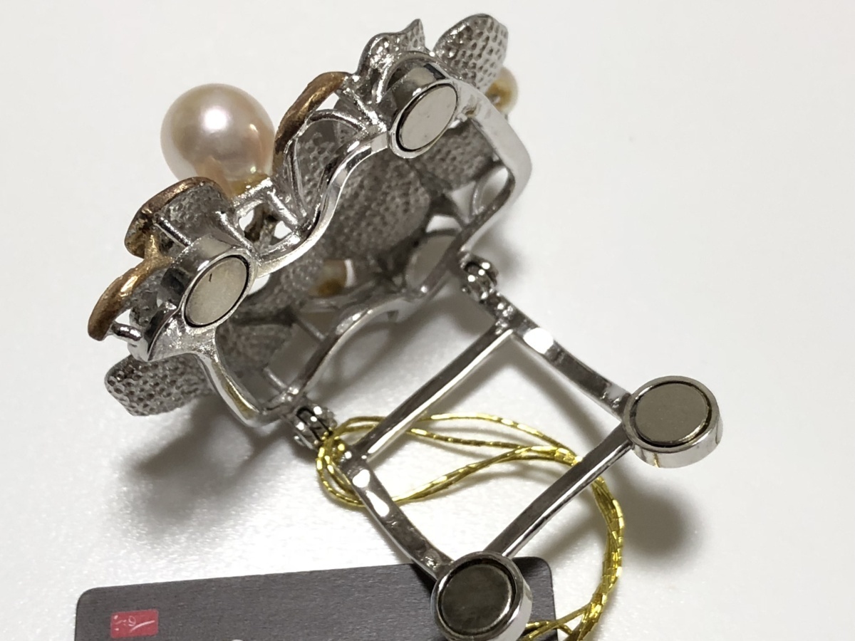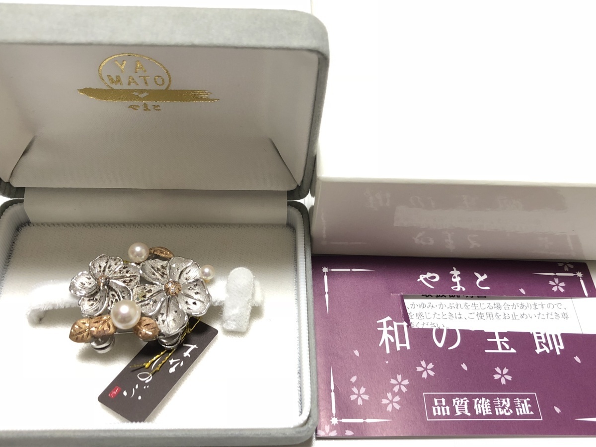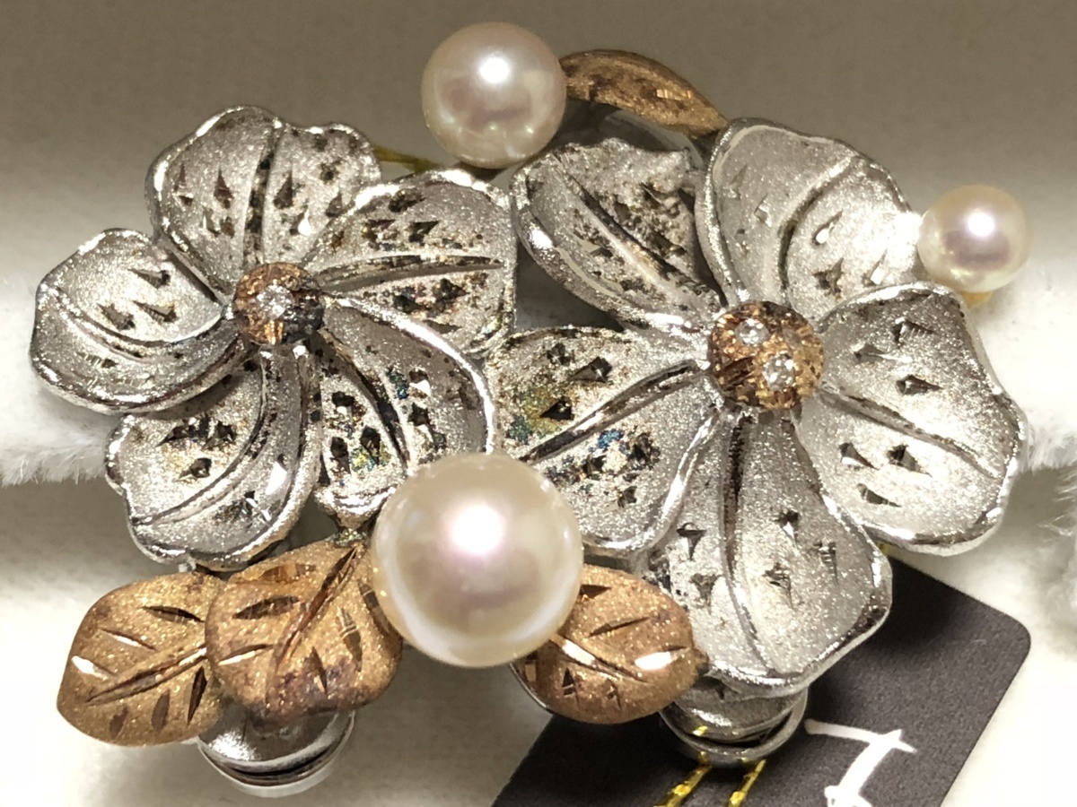 アンティーク、きものやまとの本真珠、ダイヤモンド(0.04ct)、K18、SILVERを使用した、ハナシノブデザインの帯留めです。マグネット式ですので、取り付けが簡単です。金属面には、【0.04】【K18】【SILVER】の刻印があります。金、銀部分に若干の変色があります。品質保証書・ケース付属です。 縦2.9㎝、横3.7㎝、重さ17.7g 真珠 直径4.5㎜~7.0㎜ ダイヤモンド 0.04ct