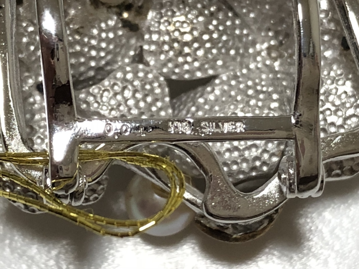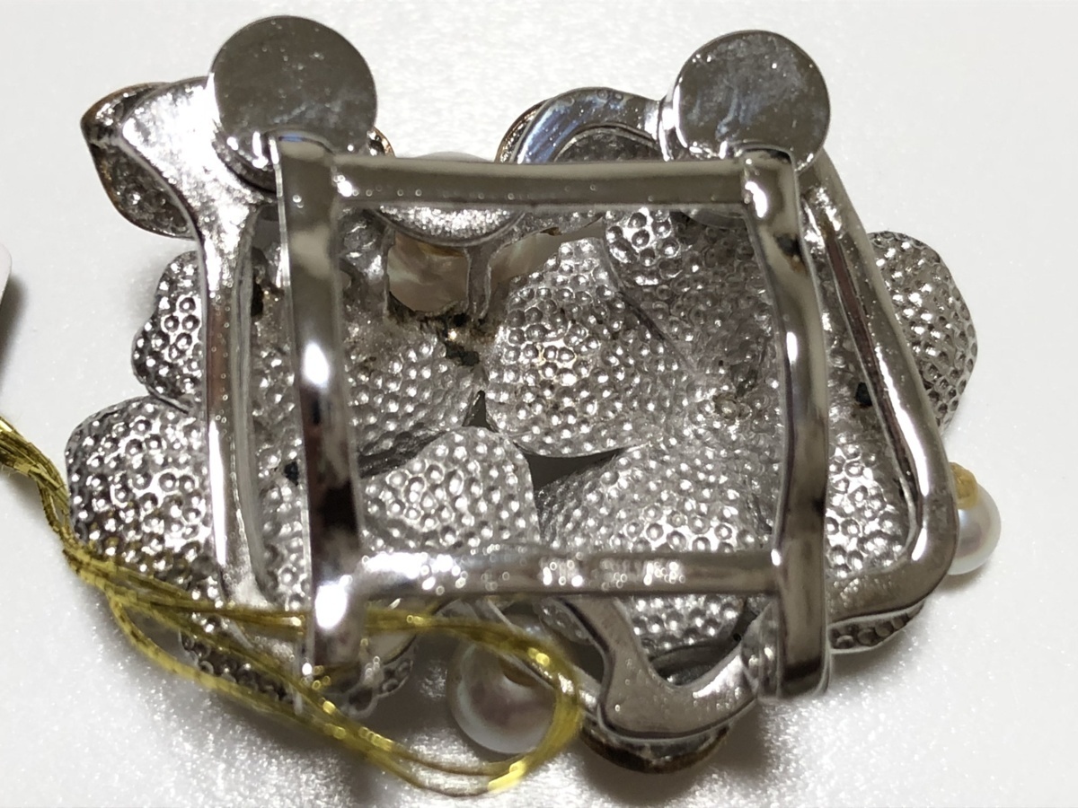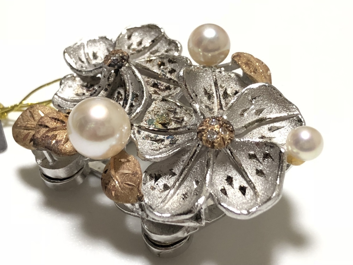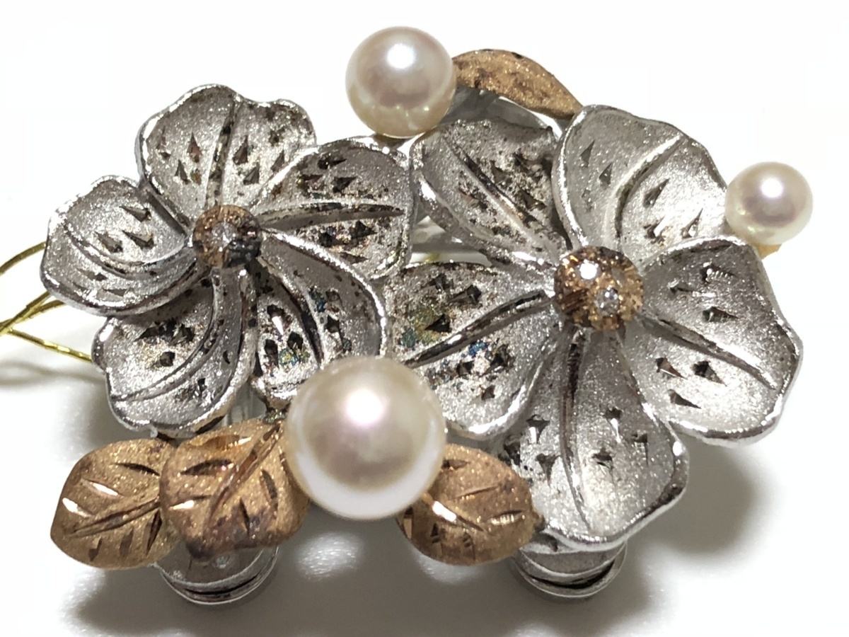 アンティーク、きものやまとの本真珠、ダイヤモンド(0.04ct)、K18、SILVERを使用した、ハナシノブデザインの帯留めです。マグネット式ですので、取り付けが簡単です。金属面には、【0.04】【K18】【SILVER】の刻印があります。金、銀部分に若干の変色があります。品質保証書・ケース付属です。 縦2.9㎝、横3.7㎝、重さ17.7g 真珠 直径4.5㎜~7.0㎜ ダイヤモンド 0.04ct