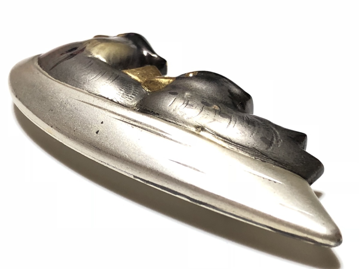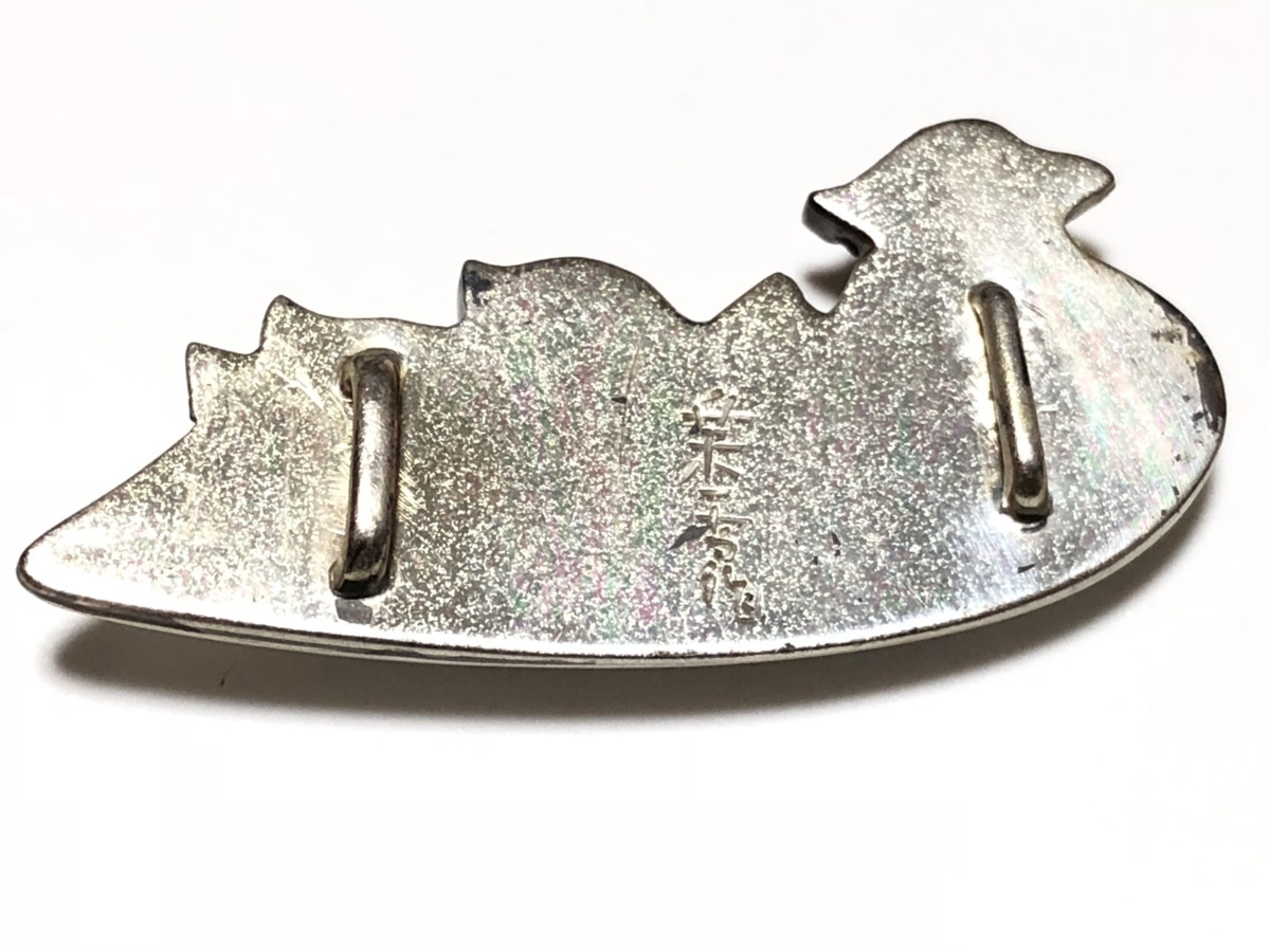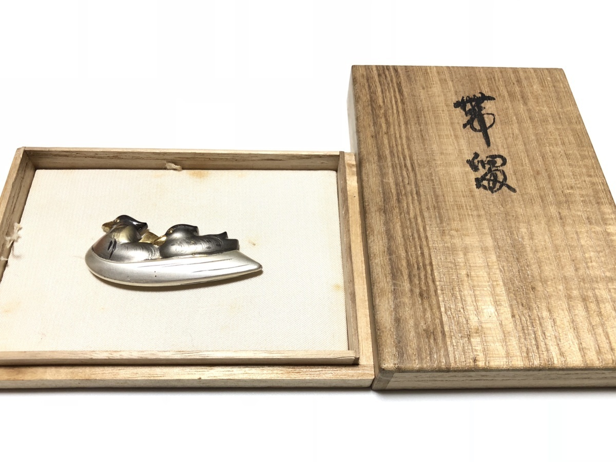 アンティークの彫金を施した、鴛鴦細工の帯留めです。作者、井上〇雪の刻印が帯留めと共箱にありますが、〇の部分の文字が読み取れません。金属面に若干の劣化があります。共箱付属です。 縦2.9㎝、横5.9㎝、重さ24.7g