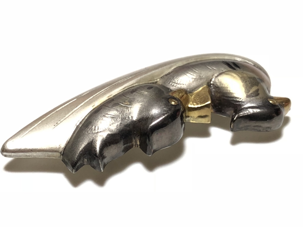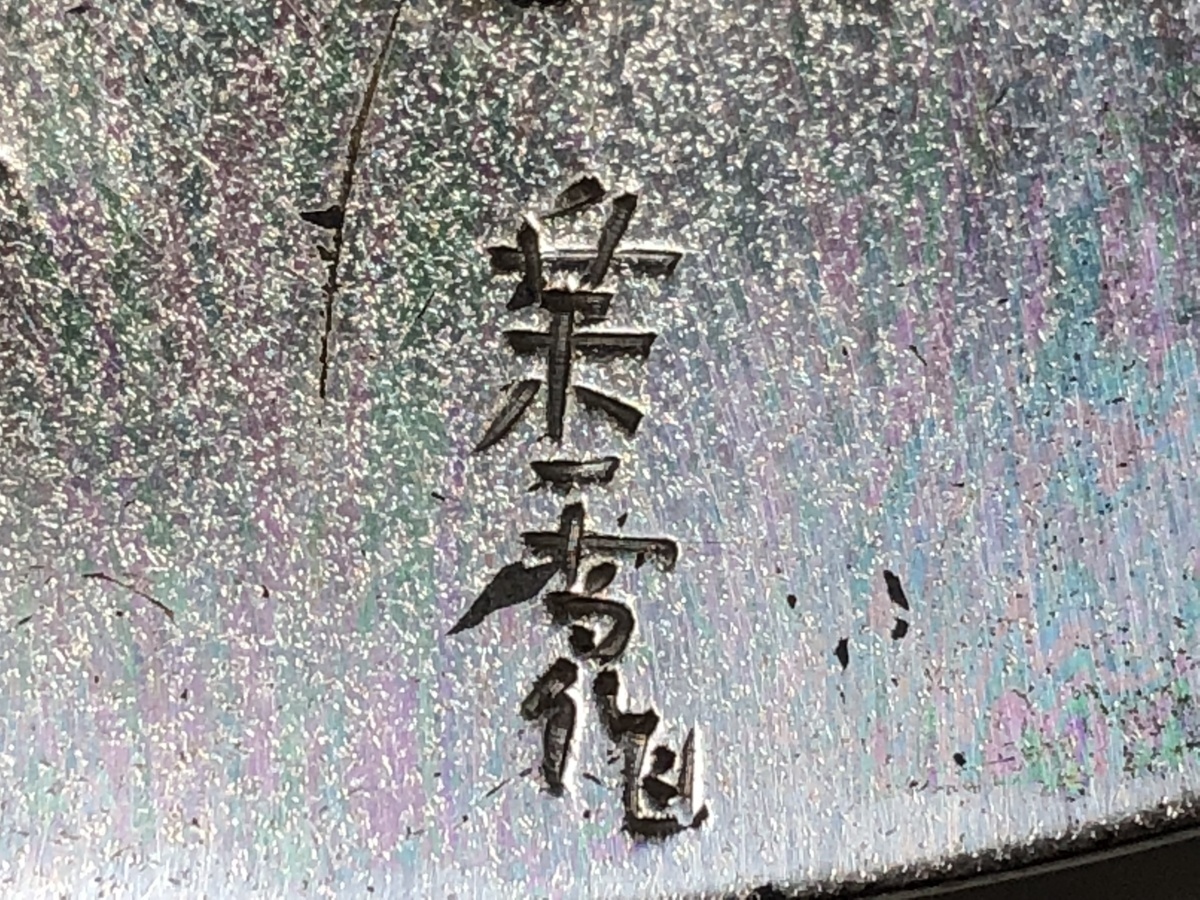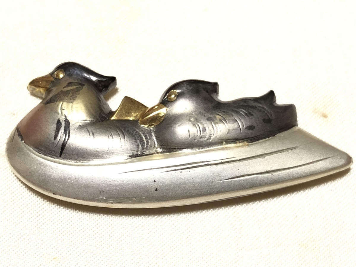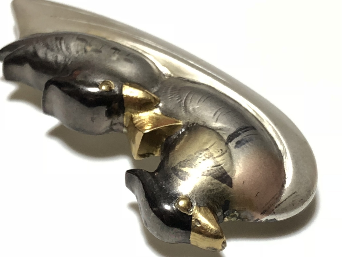 アンティークの彫金を施した、鴛鴦細工の帯留めです。作者、井上〇雪の刻印が帯留めと共箱にありますが、〇の部分の文字が読み取れません。金属面に若干の劣化があります。共箱付属です。 縦2.9㎝、横5.9㎝、重さ24.7g