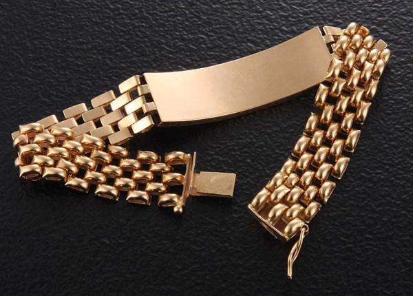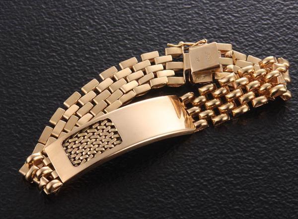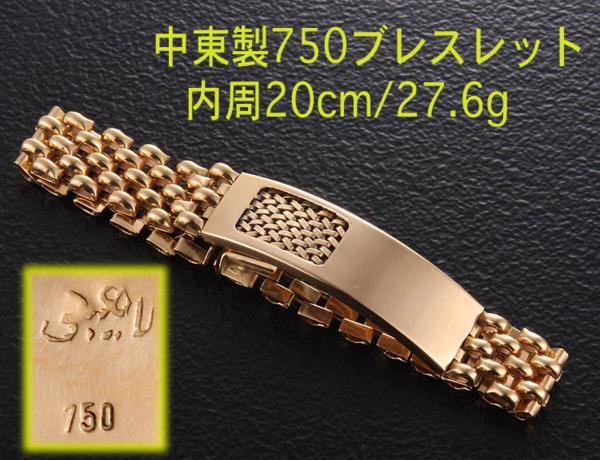 | コメント | [[全ての商品に品質保証カードが付きますのでご安心ください]] 刻印には中東製だと思われる文字があります。残念ながら私には読めませんでした。 造りの良いブレスレットだと思います。 ゴールドを薄く加工して作られていますが、それでも27.6グラムあります。 中空構造ですが、気になるような凹みや大きなキズは見られません。 |