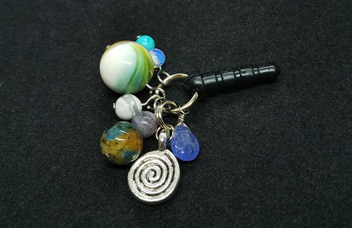 天然石付チャーム スマホピアス 夜光貝 タンザナイト K2ストーン他 シルバー色 ハンドメイド c97
