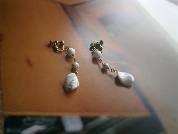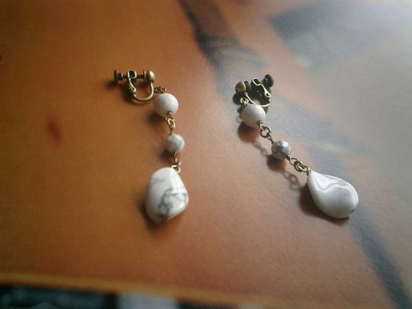 愛しいお気に入り・・シリーズです♪白の気品・・ハウライトのイヤリングです♪シックな模様の6ミリ、8ミリのラウンドカット、13×18ミリのツイストオーバルなど大きさ違い、デザイン違いのハウライトを合わせました♪オフホワイトでまとめて大人のロマンチックしています♪♪長さは全長6・5センチ位です♪ピアスにも変更出来ます♪お揃いのネックレスやブレスレットやイヤリングも出品しています♪シンプルで飽きのこないいつまでも着けられるデザインを考えて作りました!ハンドメイドをご理解頂いてノークレーム、ノーリターンでお願いします
