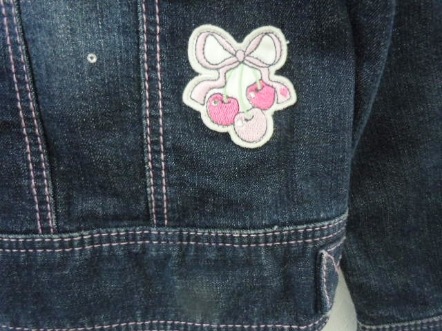 定価12800円 メゾピアノ mezzopiano のデニムジャケット・Gジャンです。ベリーちゃん、チェリーのワッツペンや胸のロゴ刺繍が目立つ一品です。前のラインストーンの付いている箇所と、後ろのダメージ加工の部分はラメが入ってキラキラして素敵です。春秋冬などに良さそうです。
