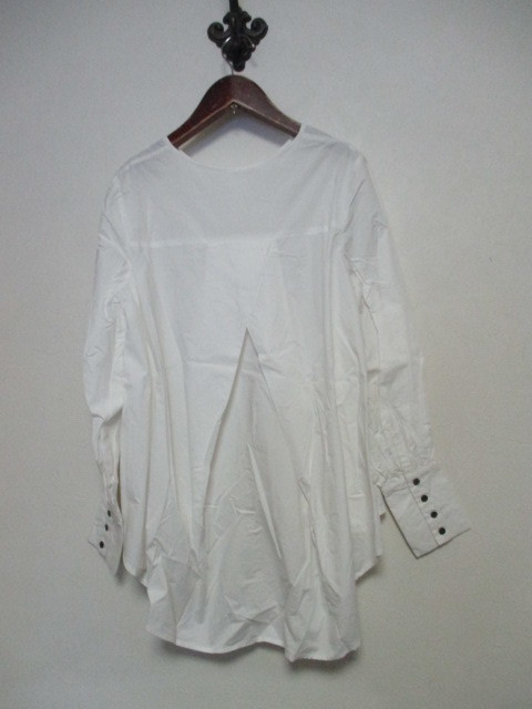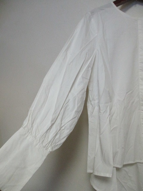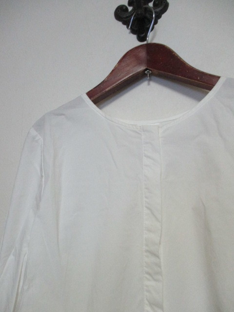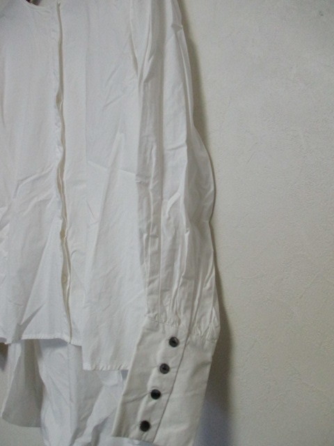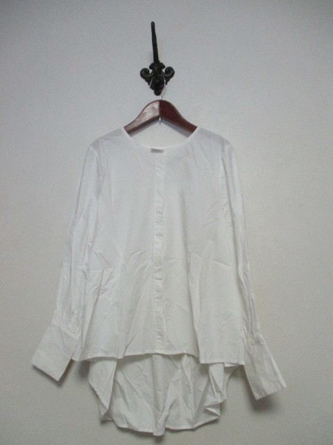 | 商品紹介 | 白の長袖シャツです。 ノーカラー、隠しボタンでスッキリとしています。 形は裾に向かってAラインで後ろのほうが丈が長くなっています。 袖口の長さが長く、その上も少しふんわりとした形です。 《素材》 綿100% |