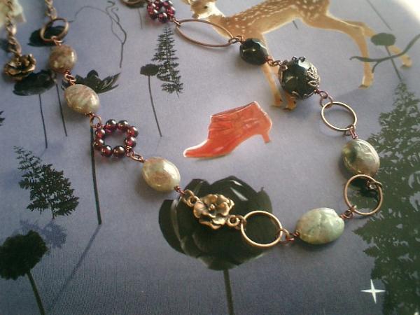 仏蘭西映画みたいに!深い赤のガーネットとグリーンガーネットのネックレスです♪♪シックなグリーンガーネットは13×10ミリ位のフラットオーバルです♪シックな座金でおめかししたガーネットは13×16ミリ位のオーバルや12ミリのオーバルです♪薔薇のチャームやガーネットリングを合わせてひっそりロマンチックしています♪♪長さは全長55センチ位で調節自由です♪♪チョーカー風にしてもブレスにしても可愛いです♪仏蘭西映画をイメージして作りました♪シンプルで飽きのこないいつまでも着けられるデザインを考えて作りました!同じデザインの長さ違いも出品しています♪ハンドメイドをご理解頂いてノークレーム、ノーリターンでお願いします