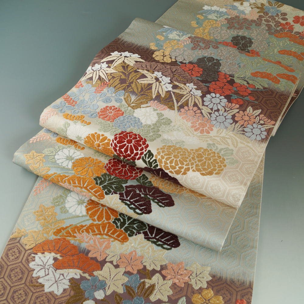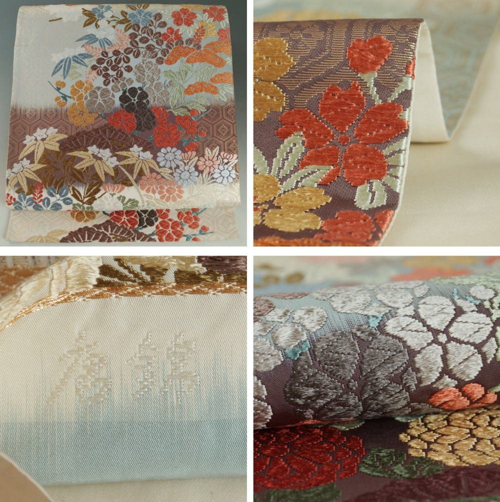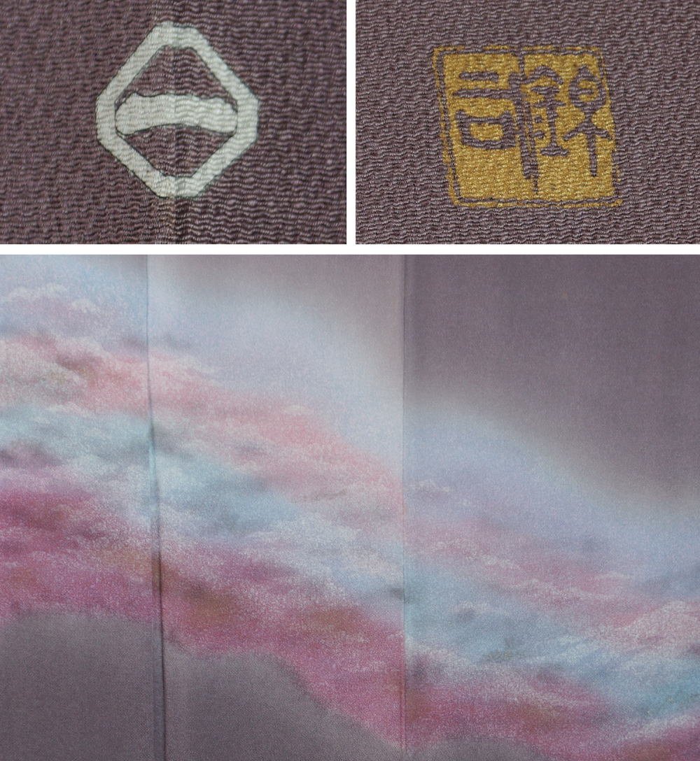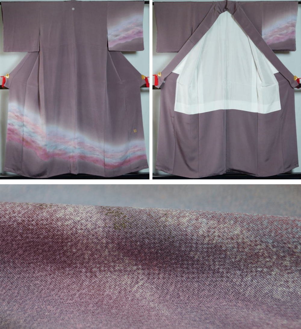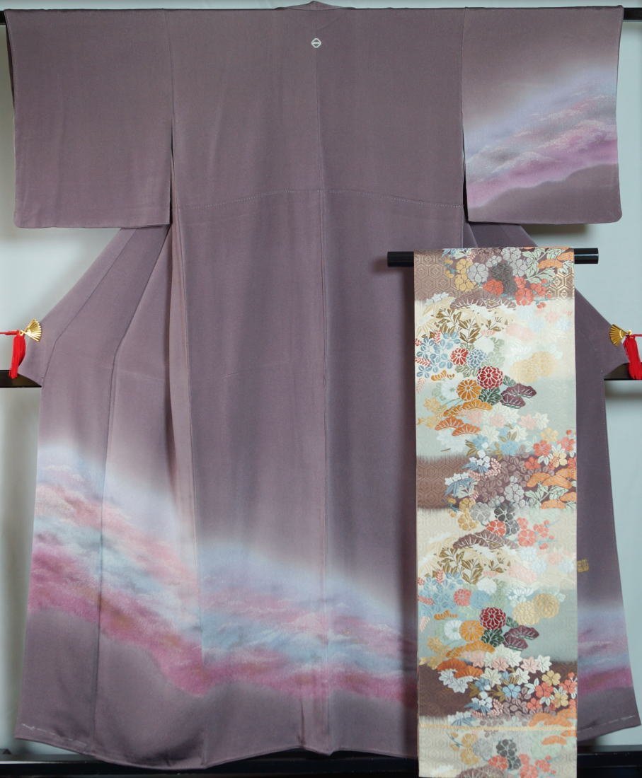 商品説明 | 紫苑色系のちりめん地に入山に淡藤・赤紫色のぼかしが施された訪問着と、 灰白色・紫鳶・浅縹色系の染め分け地に金糸の亀甲花菱、 色糸で春秋草花模様が唐織された袋帯の2点セットです。 着物は作家物で下前に落款が入っております。 ※着物;右衿の付け根の縫い目に5×1cm位の薄いシミがあります。 帯;使用されていますが、目立つシミや汚れはありません。 柄付け:六通柄 |