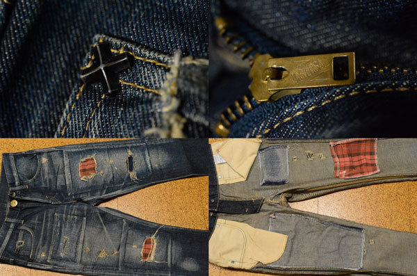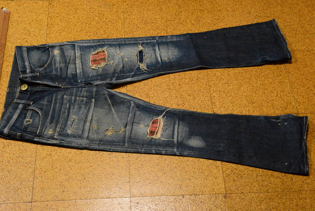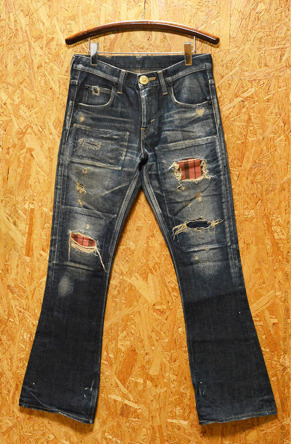全体に超リアルなダメージ加工、リメイク加工、色落ち加工が施されたクールなブーツカットデニムです。