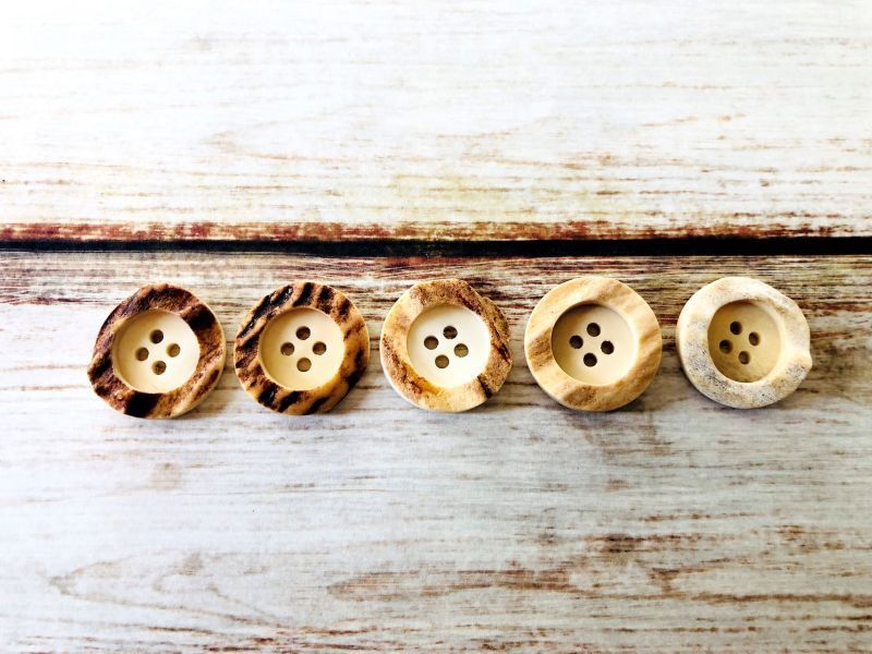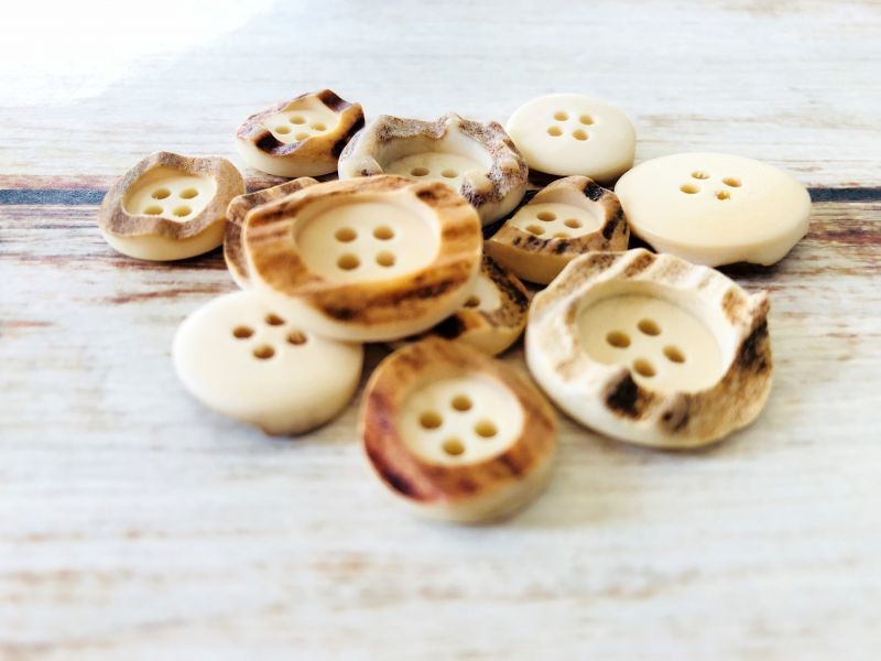 そこで角の凸凹した表面から1個1個手加工で丸くくり抜き、ボタンに加工しました。