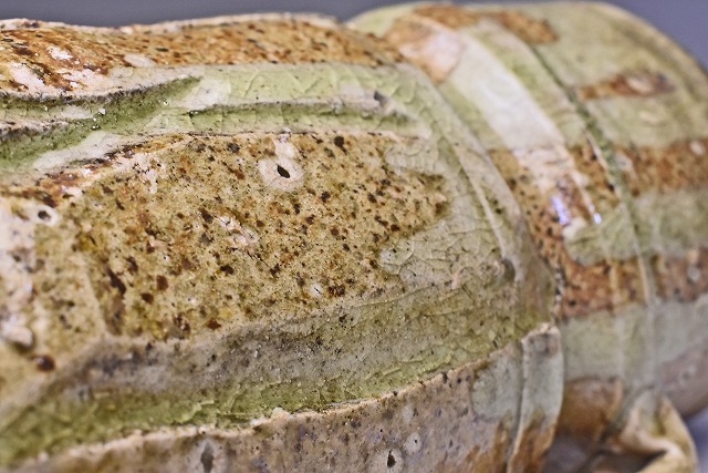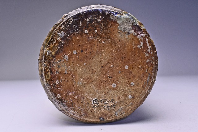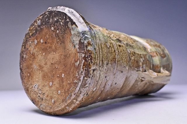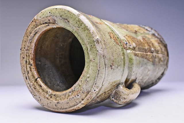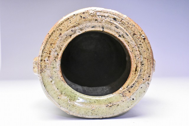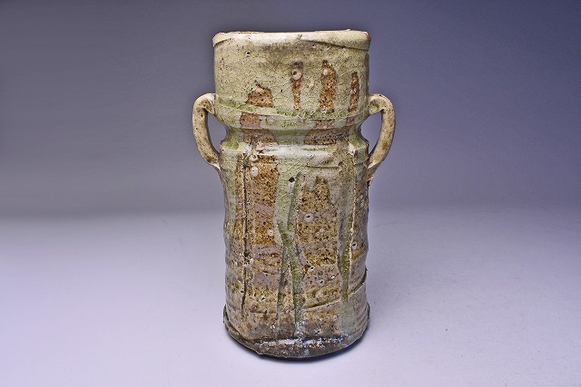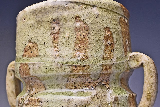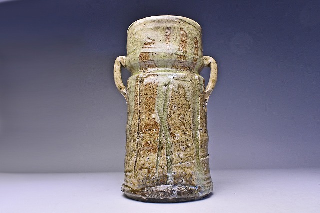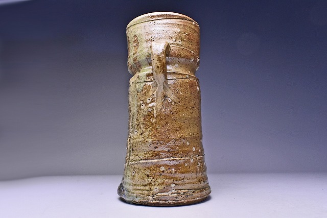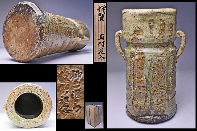 【 陶芸作品 】在印 有り ★ 伊賀 耳付 花入 ★ 木箱 ★ 力強い造形にビードロ釉が見事な景色の逸品 ★ 華道具 茶道具 ★