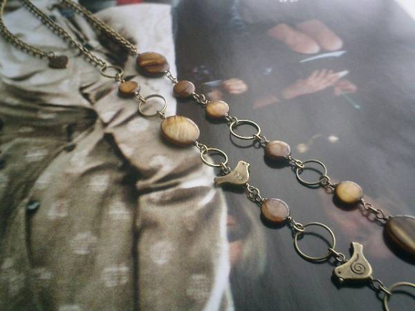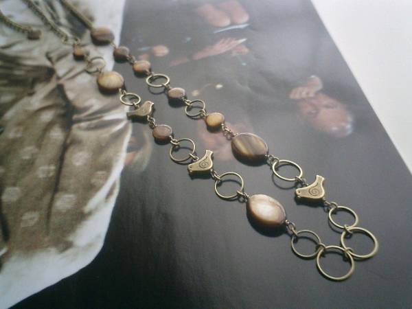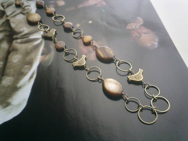 ニューヨーク・デッサンシリーズです♪キュートな小鳥さんと異素材のネックレスです♪♪シックなお色でまとめて大人のロマンチックしています♪10ミリのコイン、18ミリのオーバルのブラウンシェルに小鳥さんのメタルチャームやデザインリングを合わせて可憐な表情です♪長さは全長80センチ位で調節自由です♪2連にされてもブレスにされても可愛いです♪お揃いのネックレスやブレスレットやピアスも出品しています♪シンプルで飽きのこないいつまでも着けられるデザインを考えて作りました!ハンドメイドをご理解頂いてノークレーム、ノーリターンでお願いします