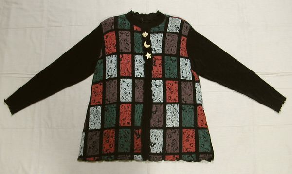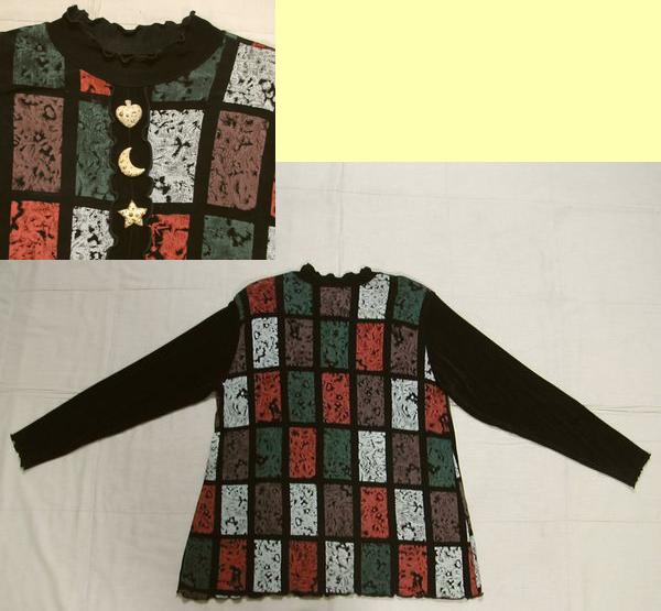 薄手で伸縮性のある素材で胸元に金色のアクセサリーが付いています。