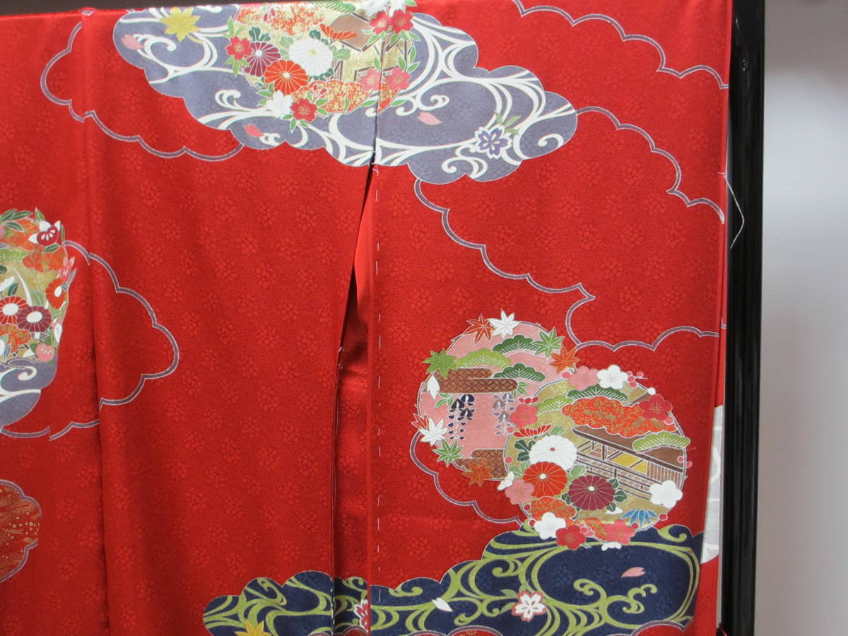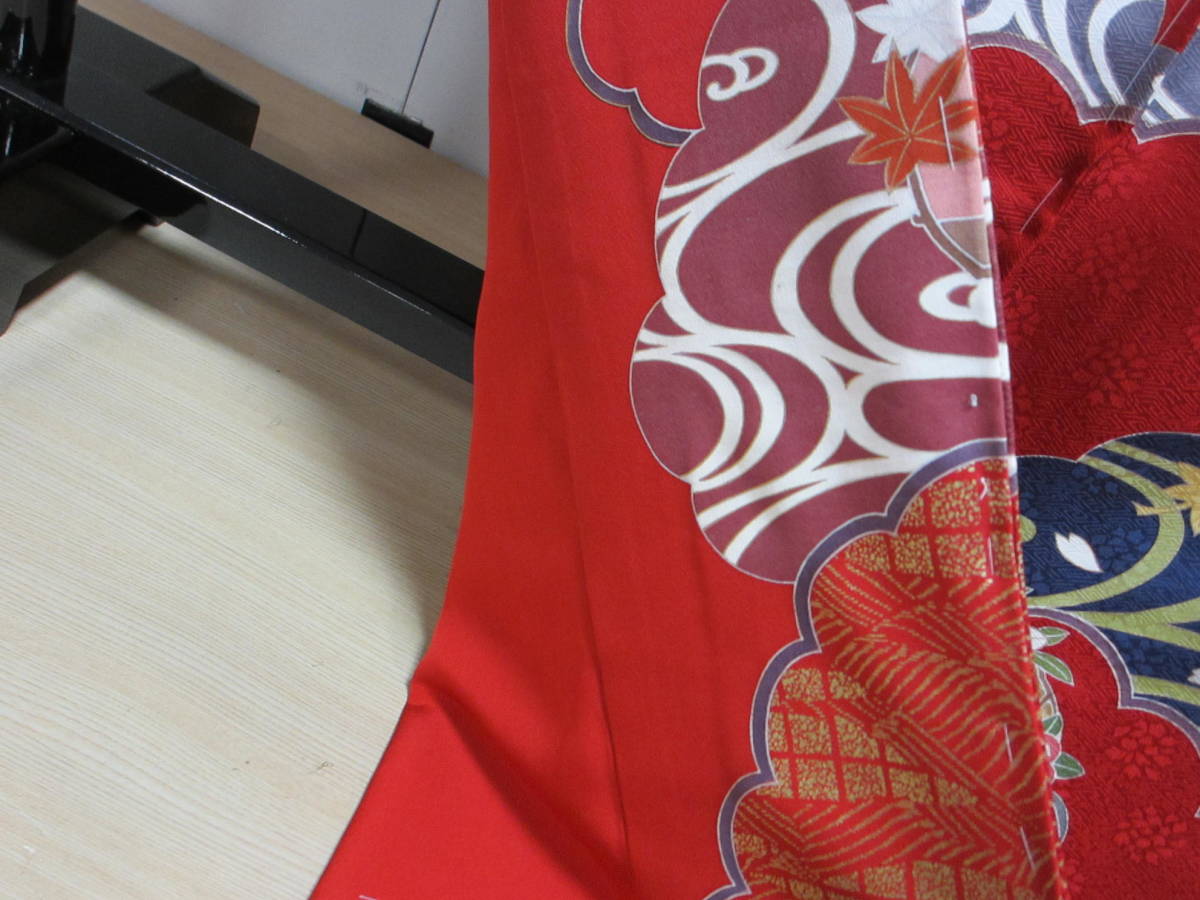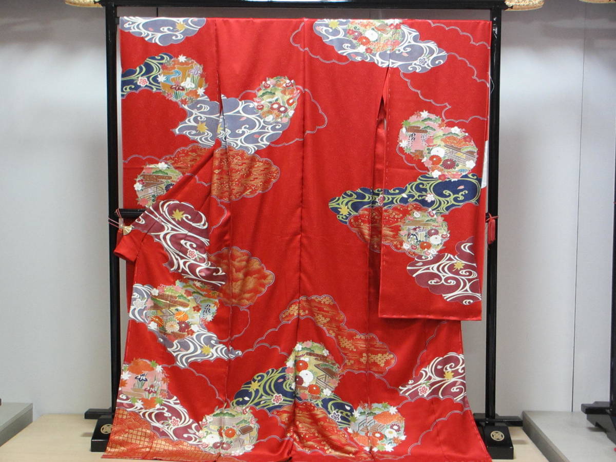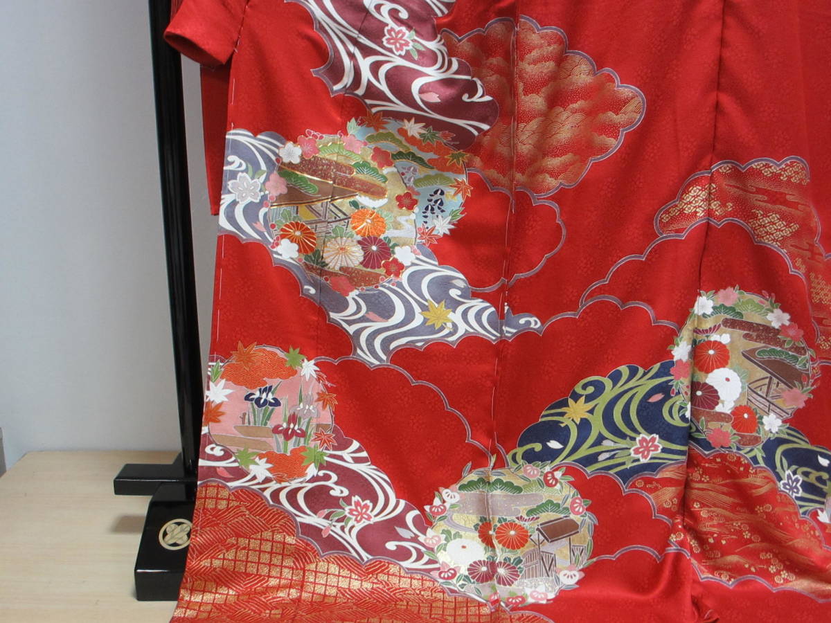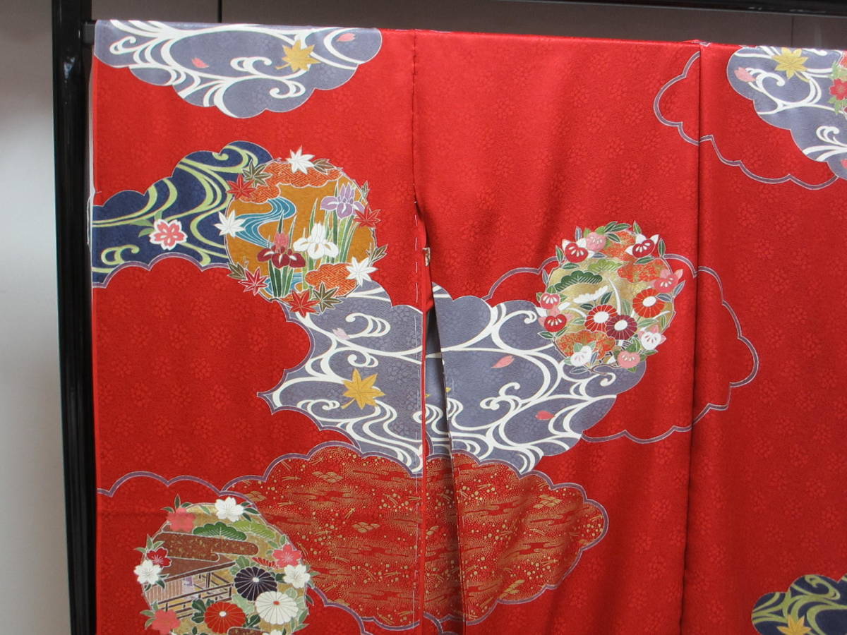 商品説明 | 綸子の赤系の生地に菊の花などの季節の花や、流水や雲取りなどの古典の柄を豪華に取り入れたお振袖です。 (未仕立品:反物幅約40cm:絹100%:未仕立て品:45069475S) |