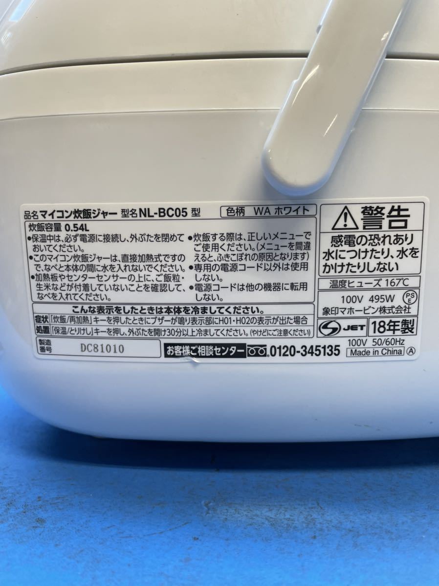 ZOJIRUSHI 象印 マイコン 炊飯ジャー NL-BC05 18年製 WA ホワイト 炊飯器 中古 動作確認済