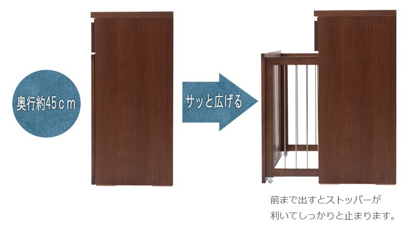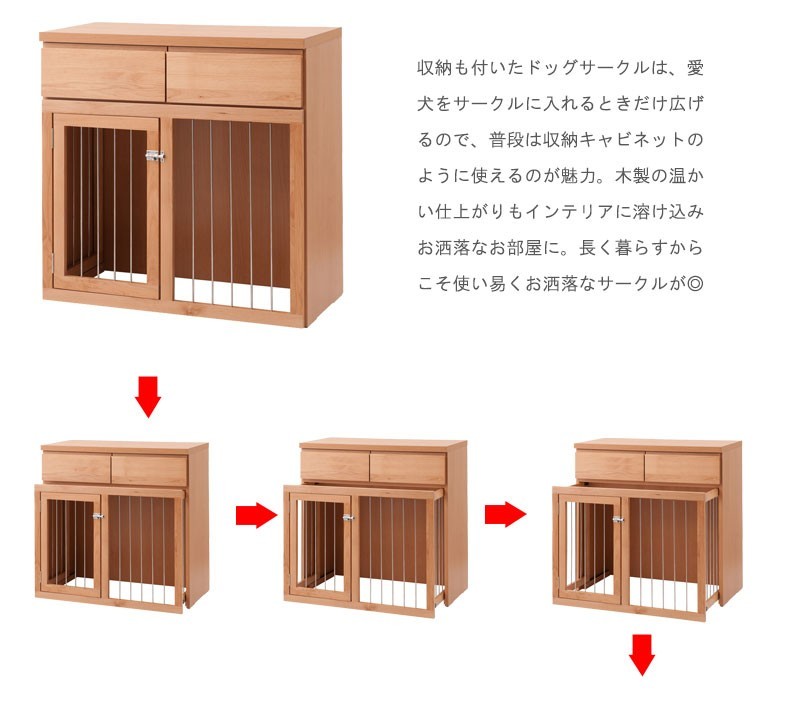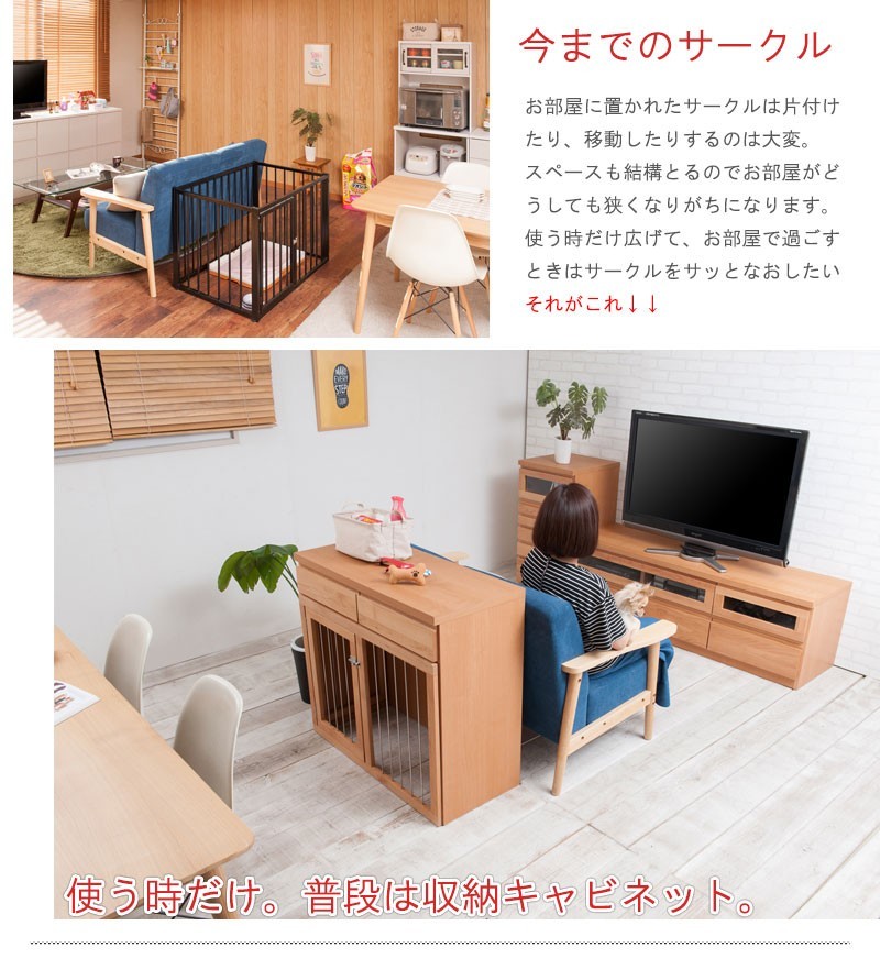 ◇お部屋で遊ぶときは広々と。ワンちゃんをケージに入れる時だけ前にスライドさせて。扉はロック式で人は簡単に開けることができ、中のワンちゃんは開ける事ができないワンタッチロックを採用。長く暮らすからこそ使い易くお洒落なサークルが◎他のシリーズと合わせて、リビングや寝室など、場所を選ばず、お洒落に設置できます