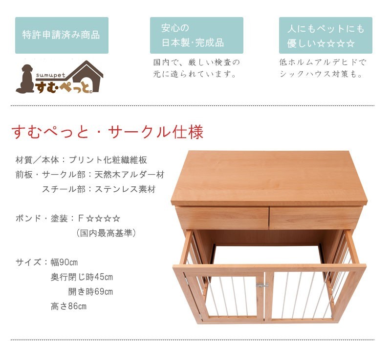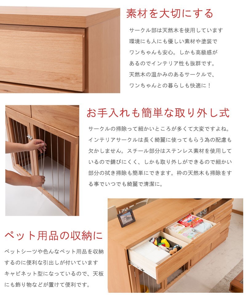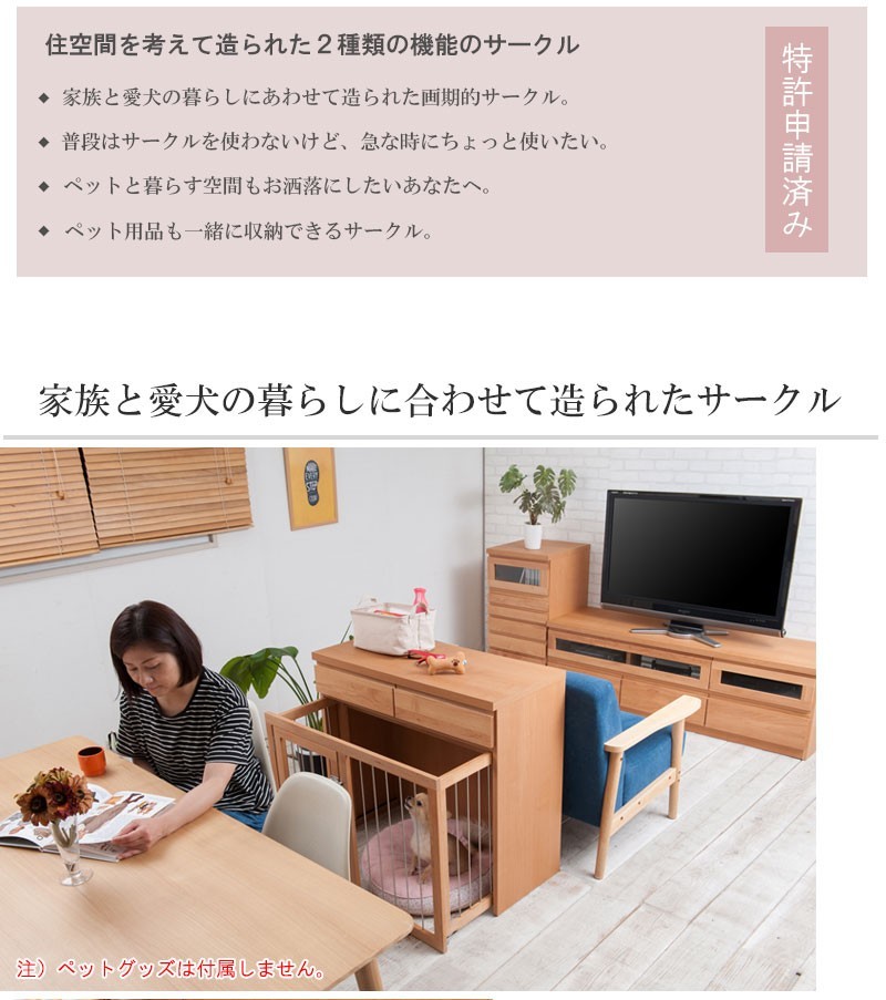 ◇スッキリとしたデザインの扉や前板は木目の綺麗なアルダー材を使用。アルダー材特有の美しい木目をそのままいかした天然木の温かみを是非。愛犬との過ごし易さの住空間を考えて造られたペットケージ『すむぺっとシリーズ』。インテリア性も兼ね備え、収納も付いた便利なドッグサークルです。