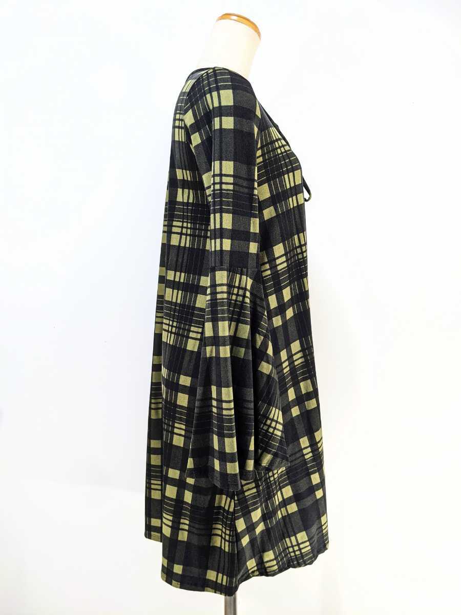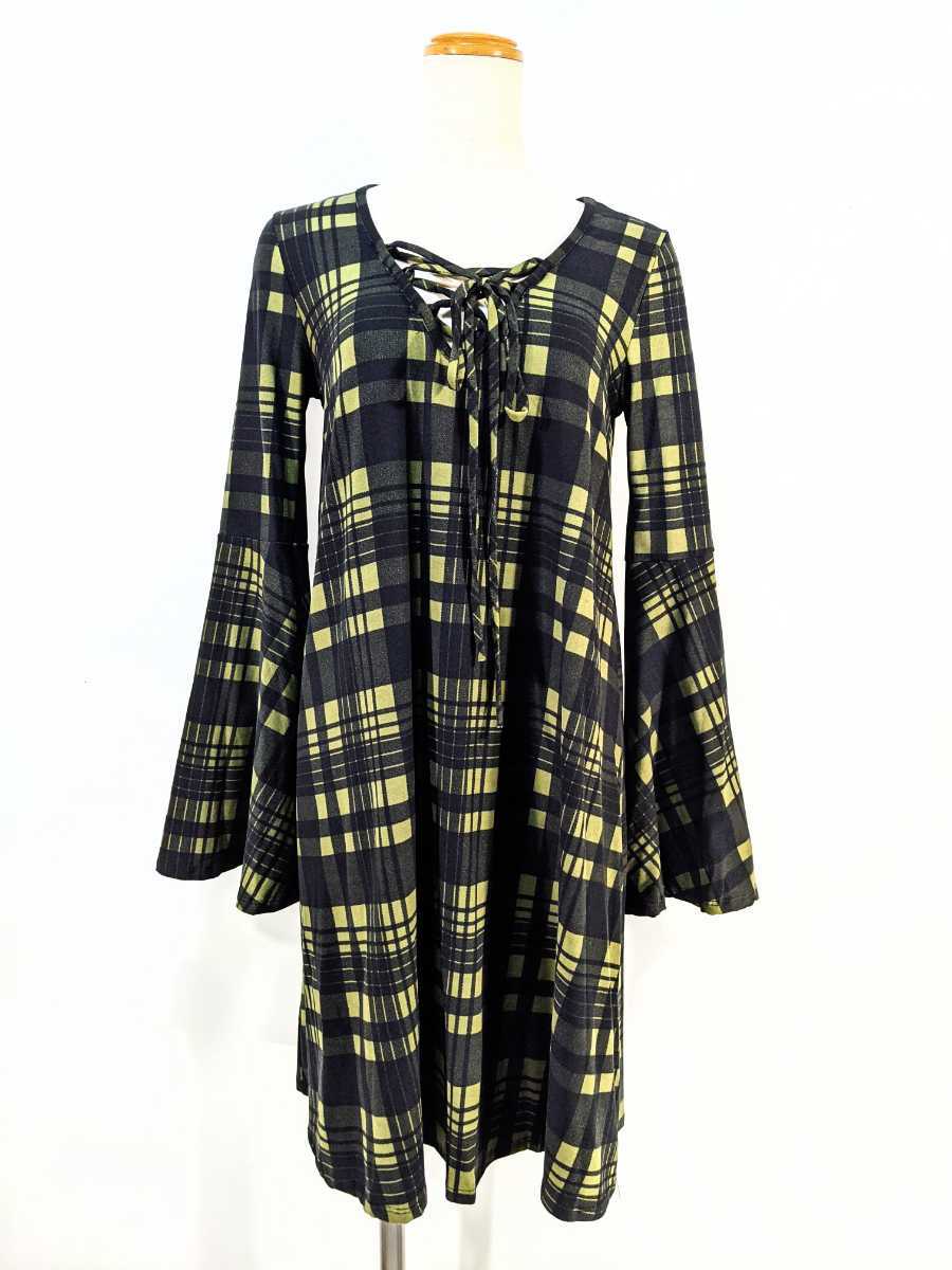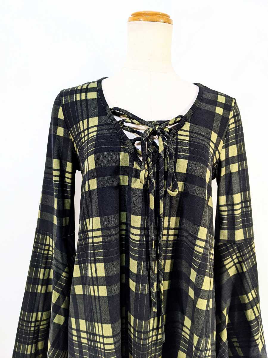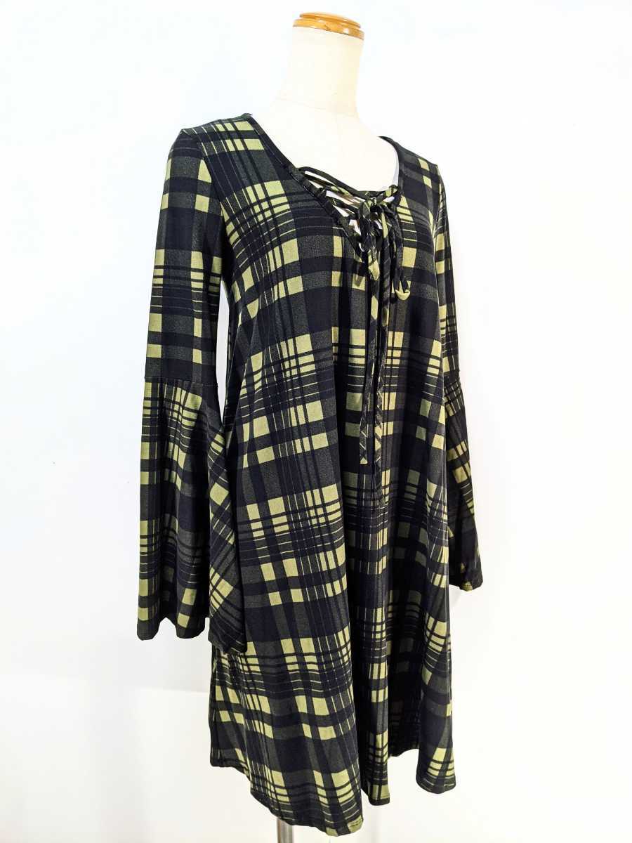 胸元の編み上げデザインとたっぷりのベル袖、ゆるめのフレアーが効いたスカートの美しさと、あまり出回らないオリーブグリーン色のチェック柄が個性を発揮しています!